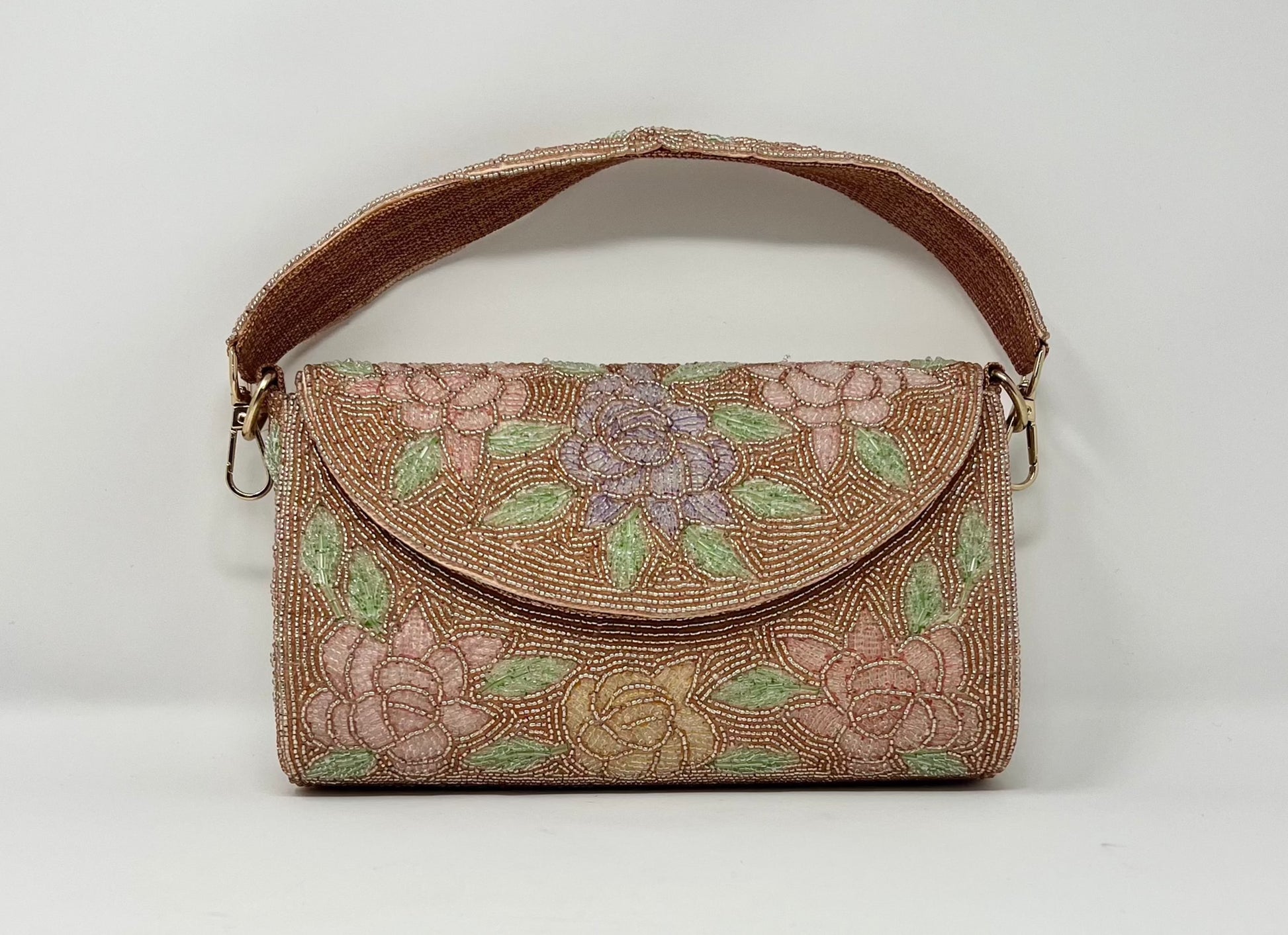 Hand embroidered with beads in intricate floral design. Silk fabric interior.