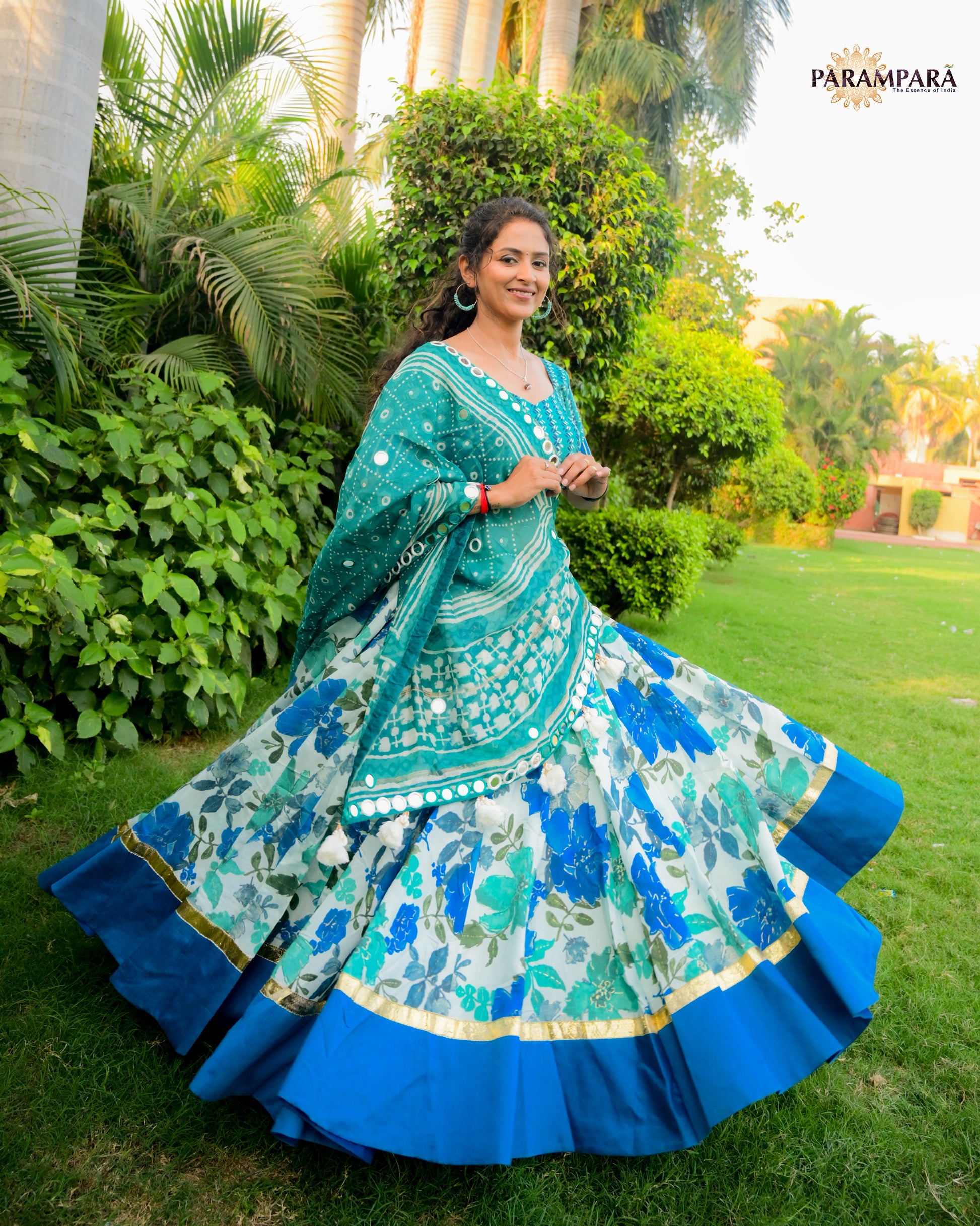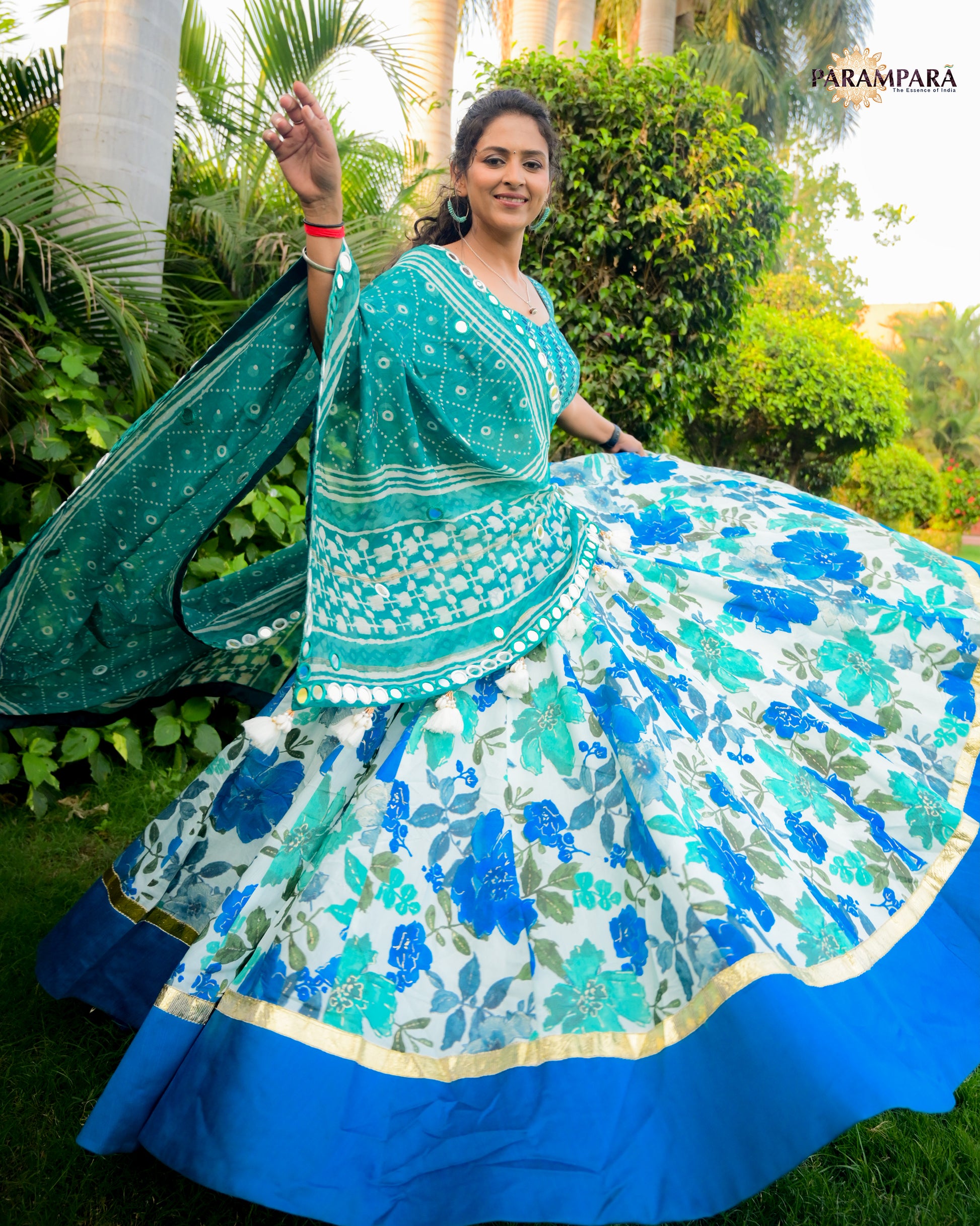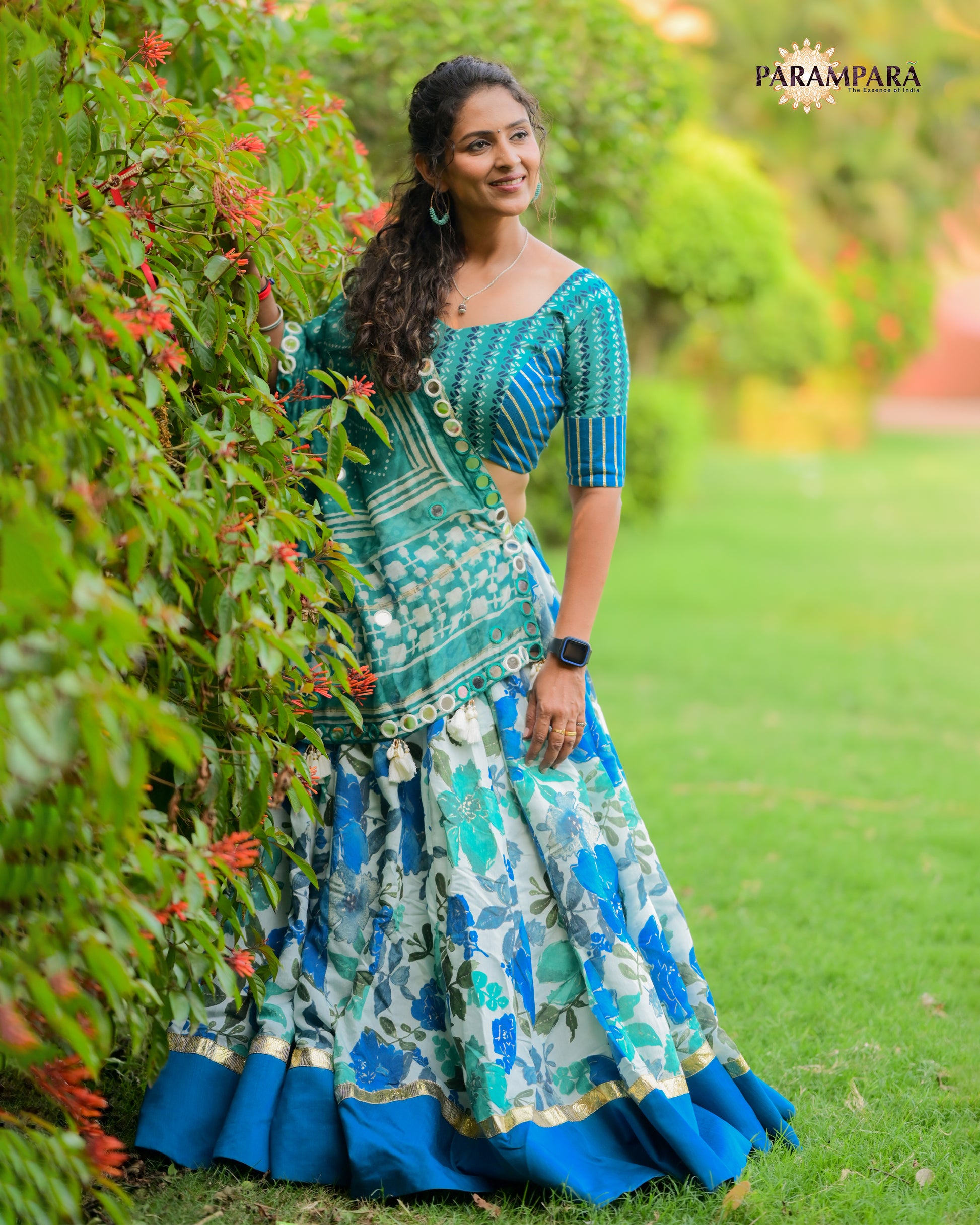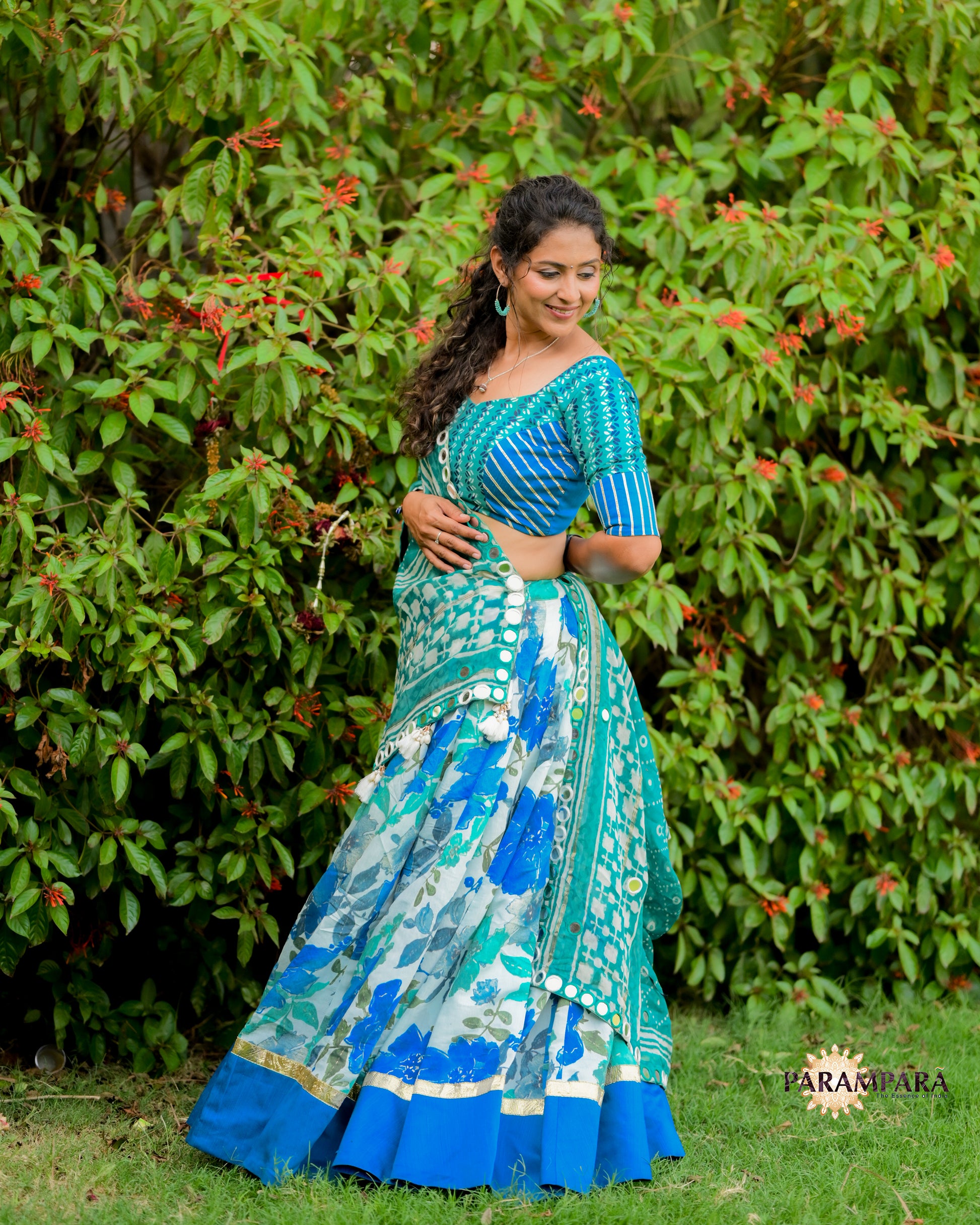 Beautiful Blue and Green Chaniya Choli in Floral Design.