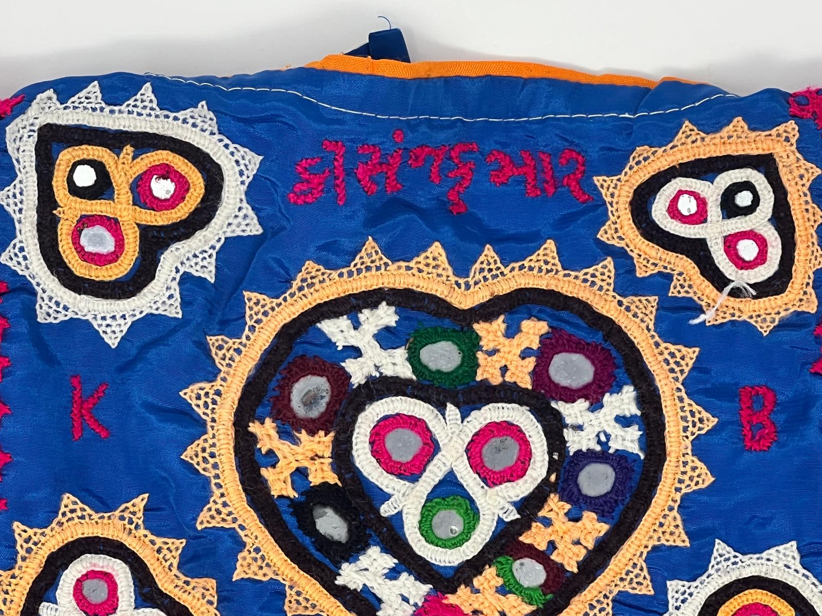 The vest is adorned with colorful thread embroidery, mirror work, and tassels along the edges, showcasing a rich blend of patterns, including geometric shapes, floral motifs, and teardrop designs.