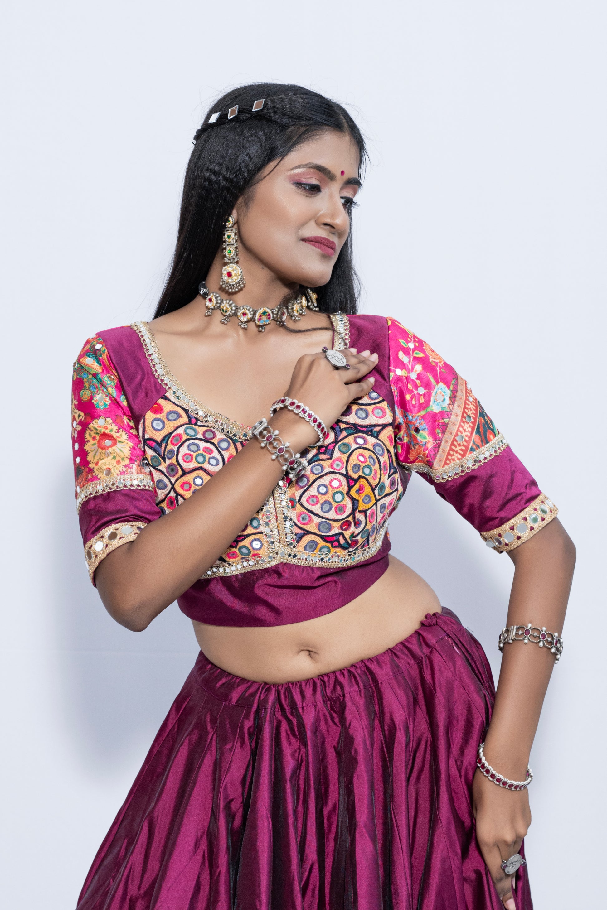The deep maroon Chaniya is made with intricate patterns and colorful embroidery, showcasing a delightful blend of floral and geometric motifs. Accentuated with delicate borders and shimmering embellishments, the skirt captures attention with its rich and detailed craftsmanship. Made from Digitally Printed Silk Fabric.