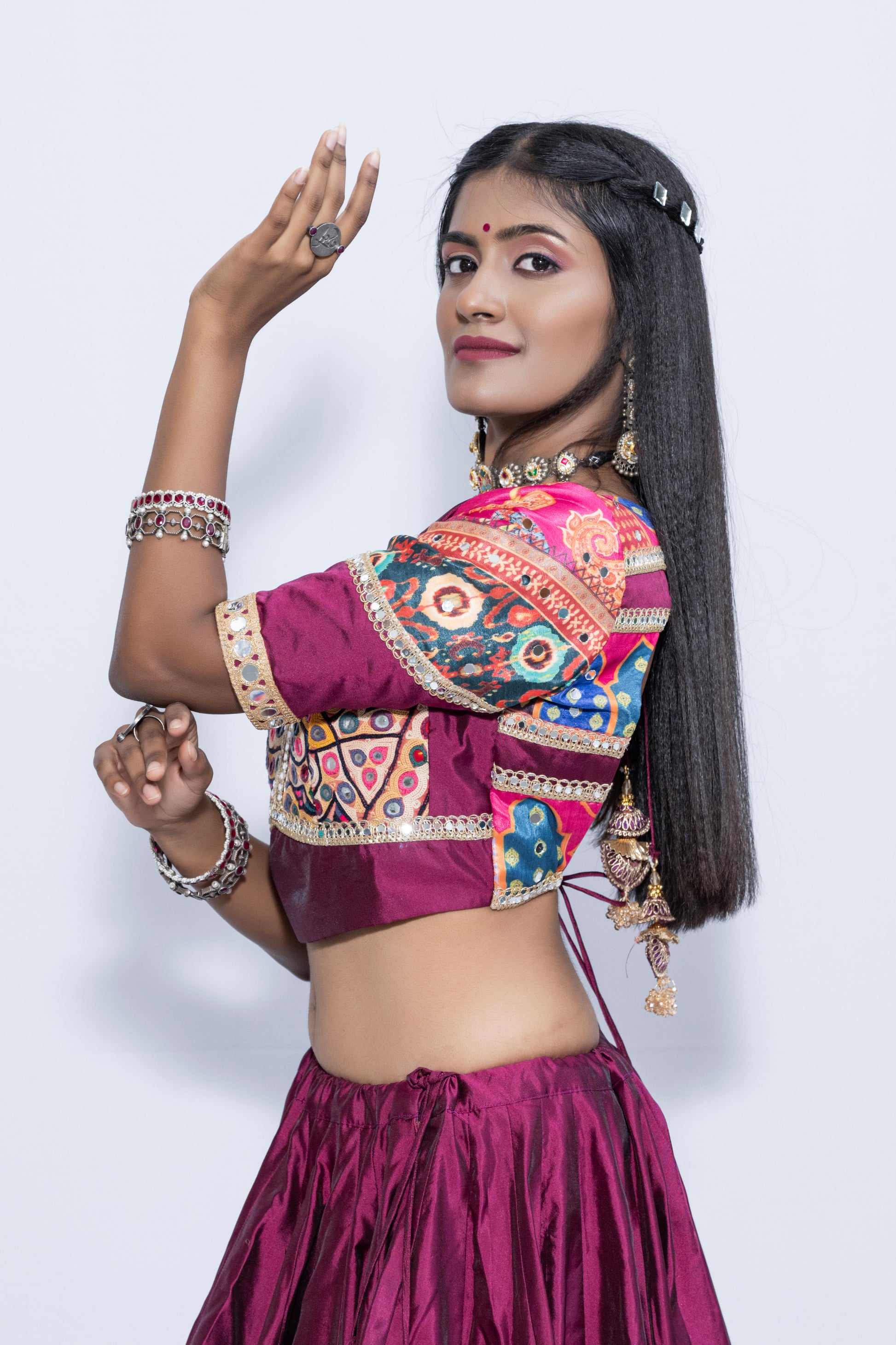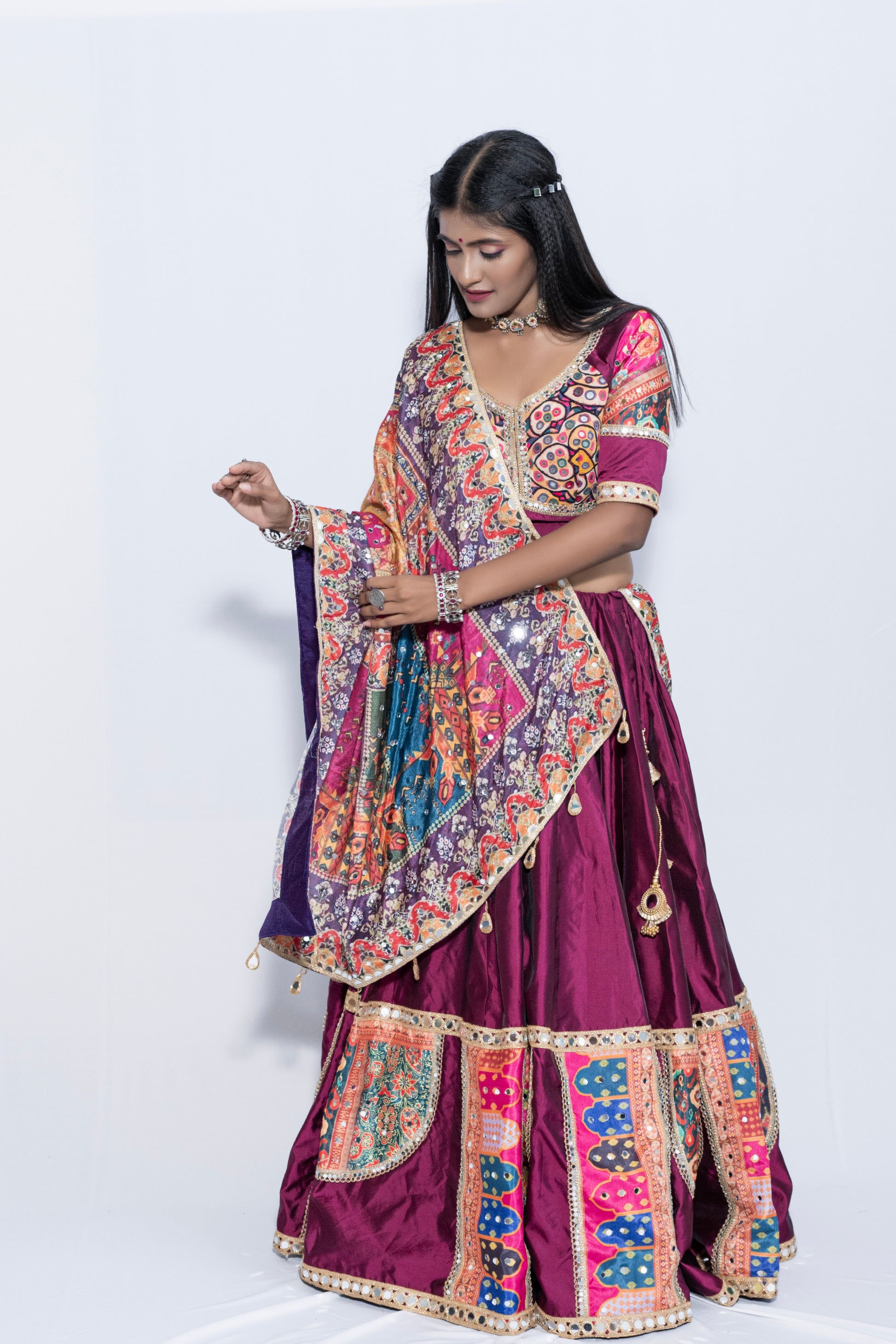 The standout feature of this is the dupatta. It boasts a stunning array of colors, including shades of purple, orange, and pink, seamlessly blending together. The dupatta is adorned with elaborate floral designs and intricate patterns, making it a perfect complement to the rich maroon color of Chaniya and blouse along with handmade tassel at pallu side with complements perfectly with colors of chaniya choli.