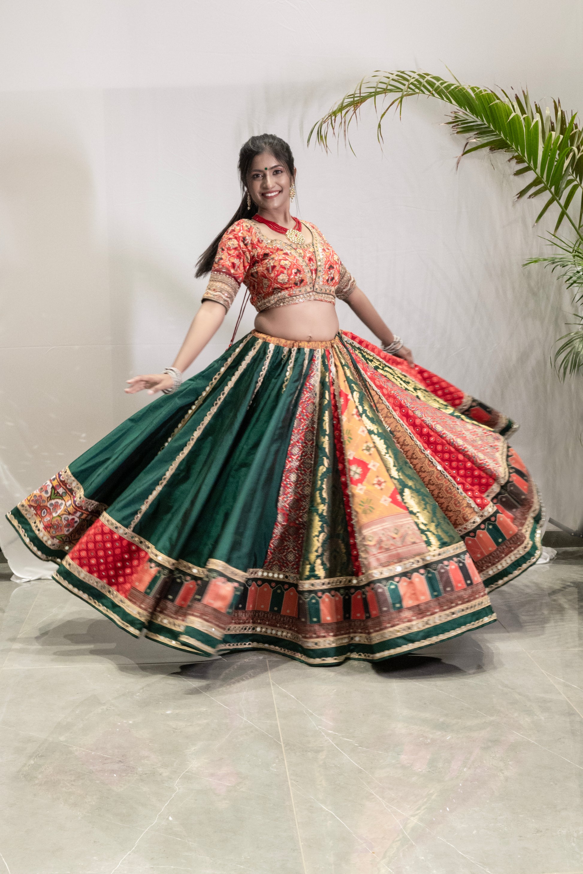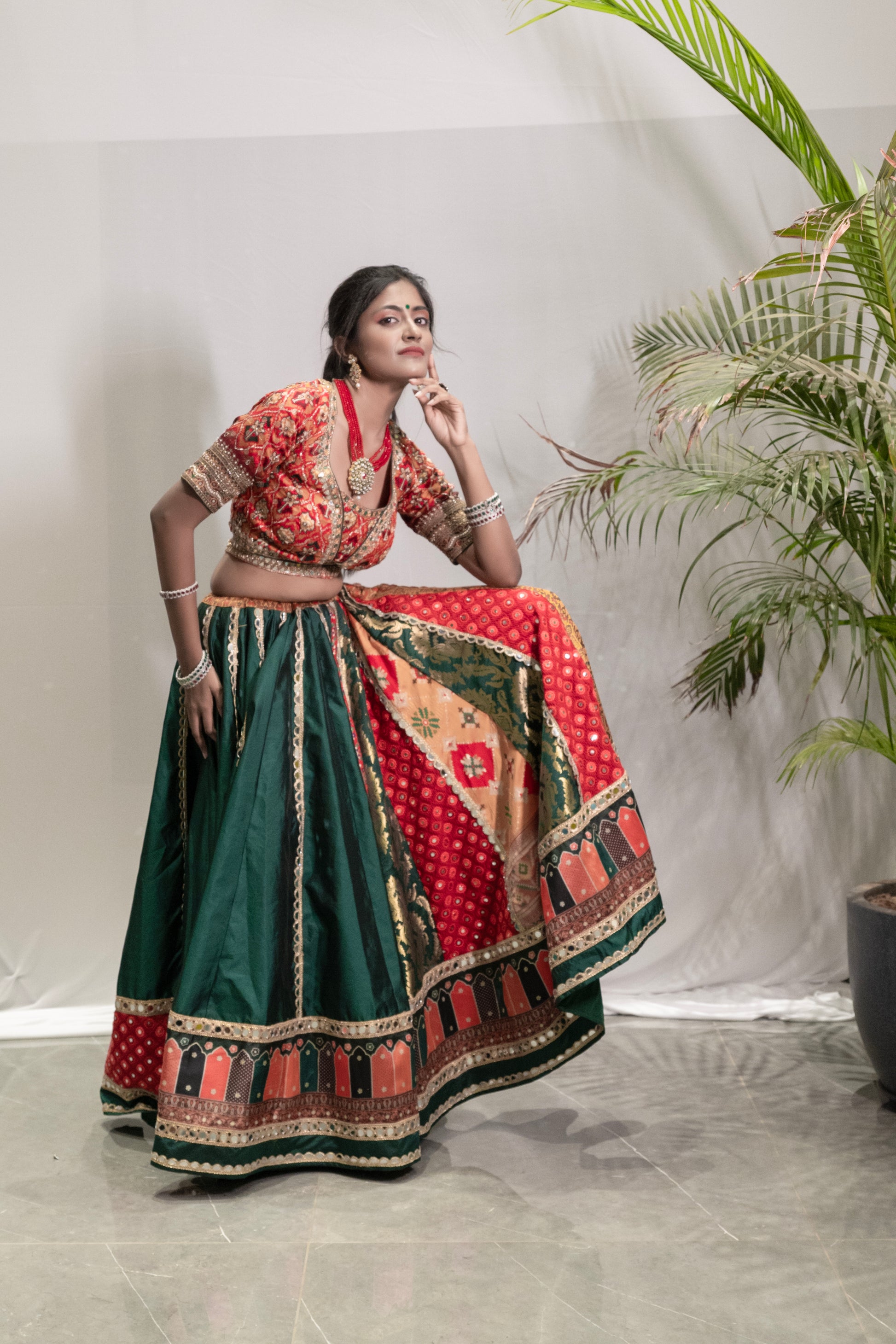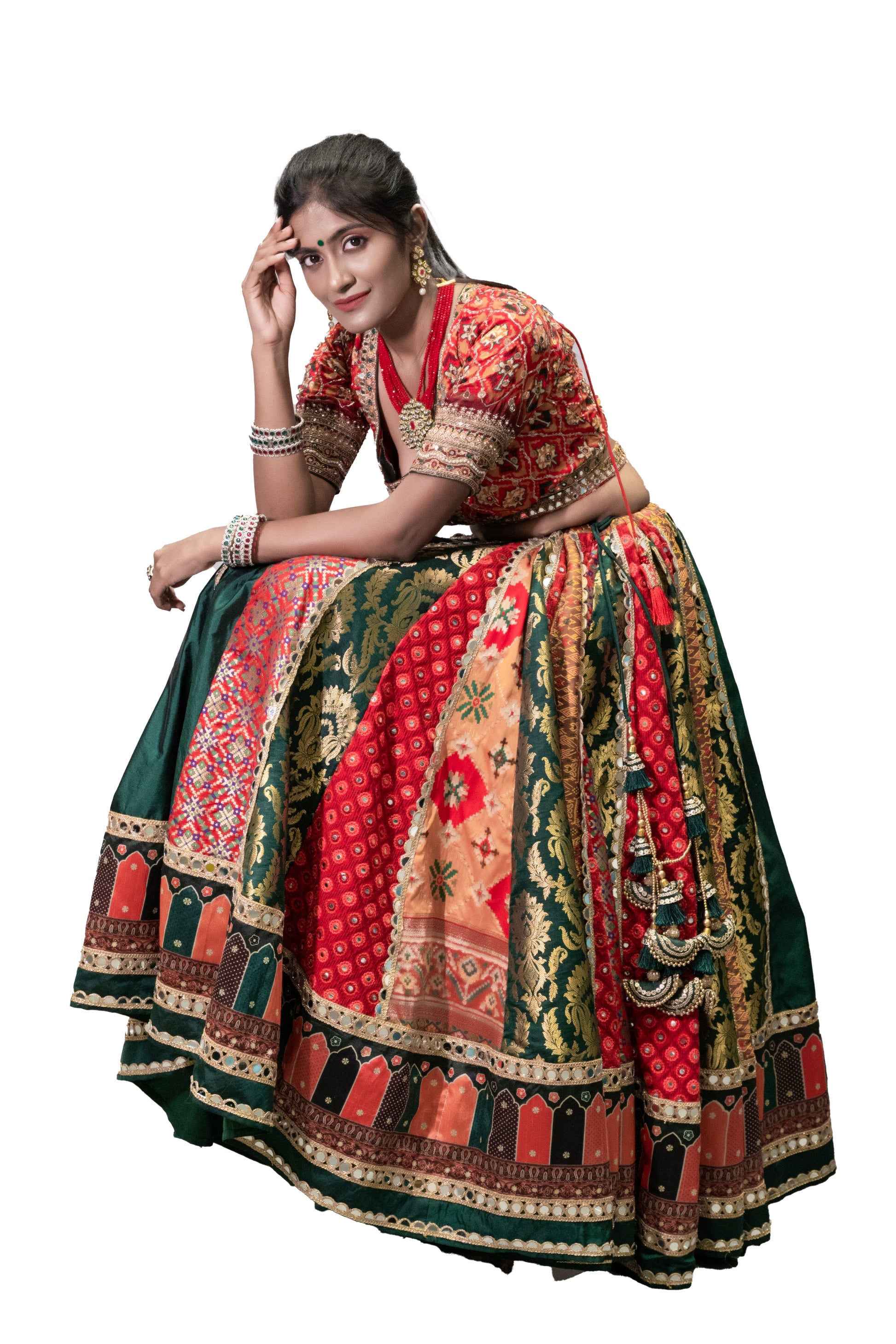 This beautiful and elegant piece of chaniya is made using collection of different art and silk work with geometric design using Embroidery Fabric on silk.