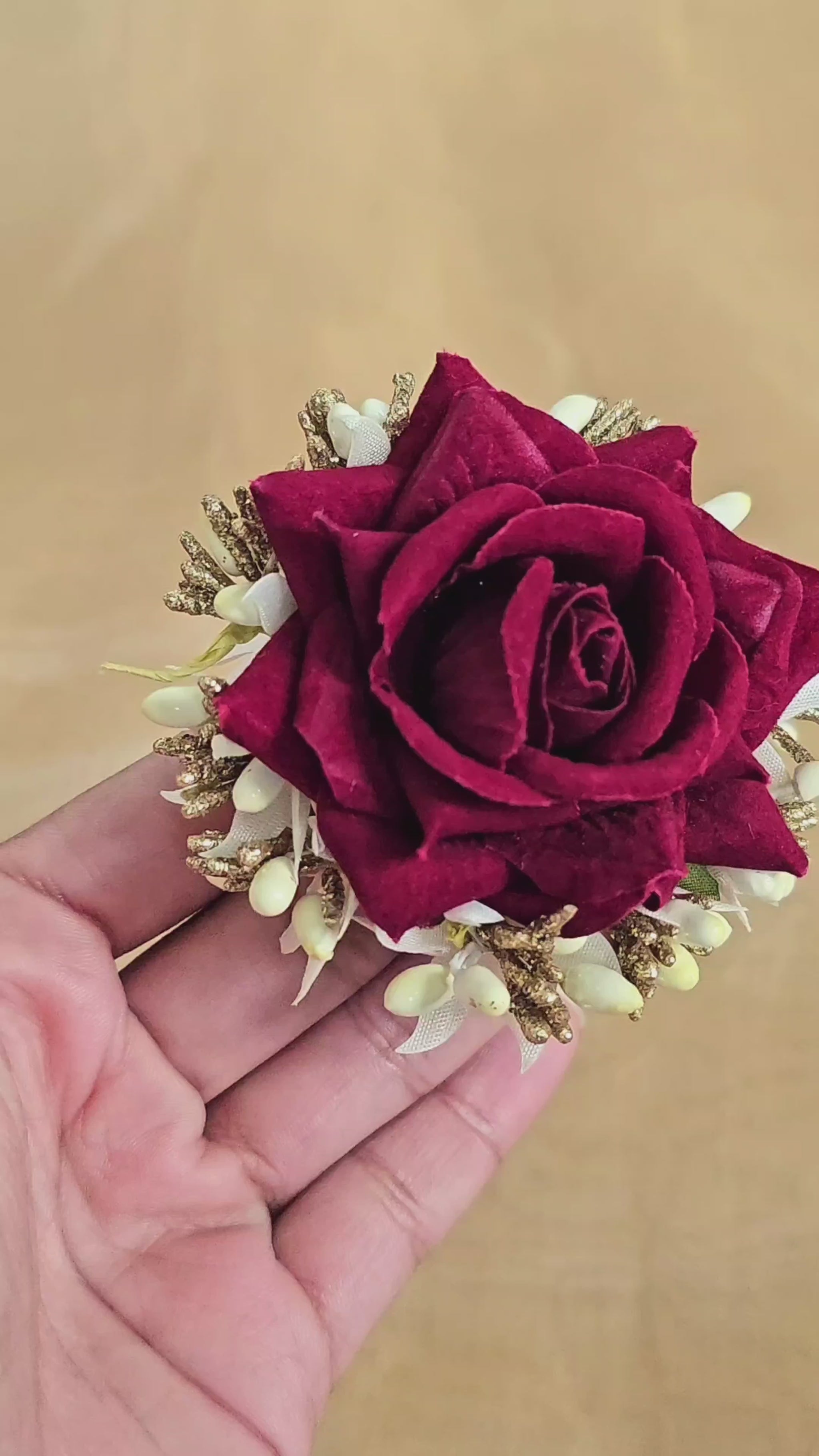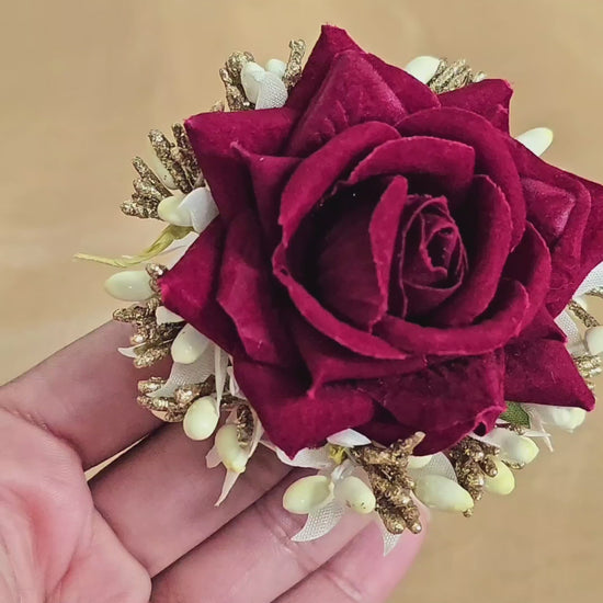 Elegant and romantic, this deep burgundy fabric rose hair pin is surrounded by golden buds and ivory accents. Ideal for weddings, parties, or adding a refined touch to evening wear, it pins securely into buns, braids, or loose styles.