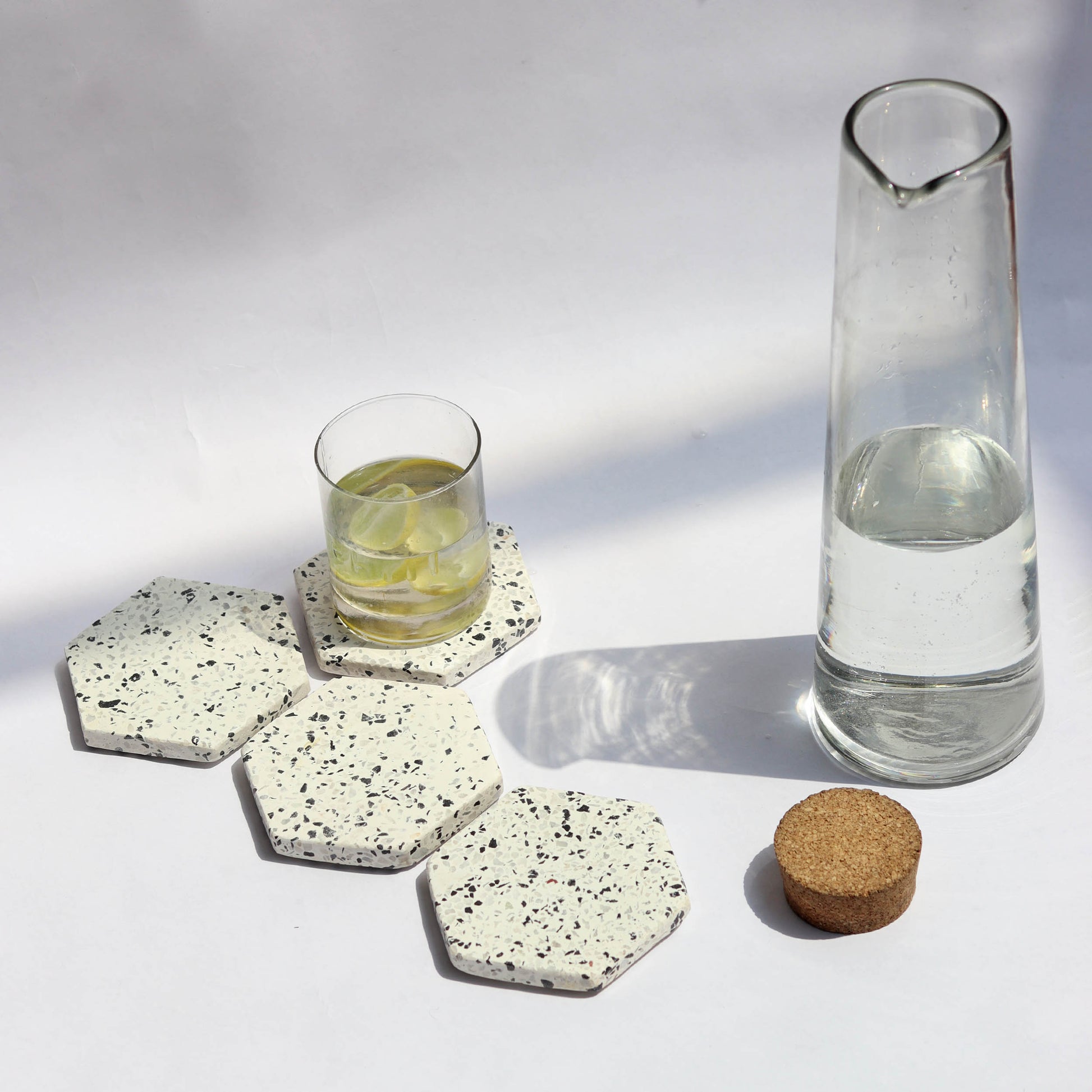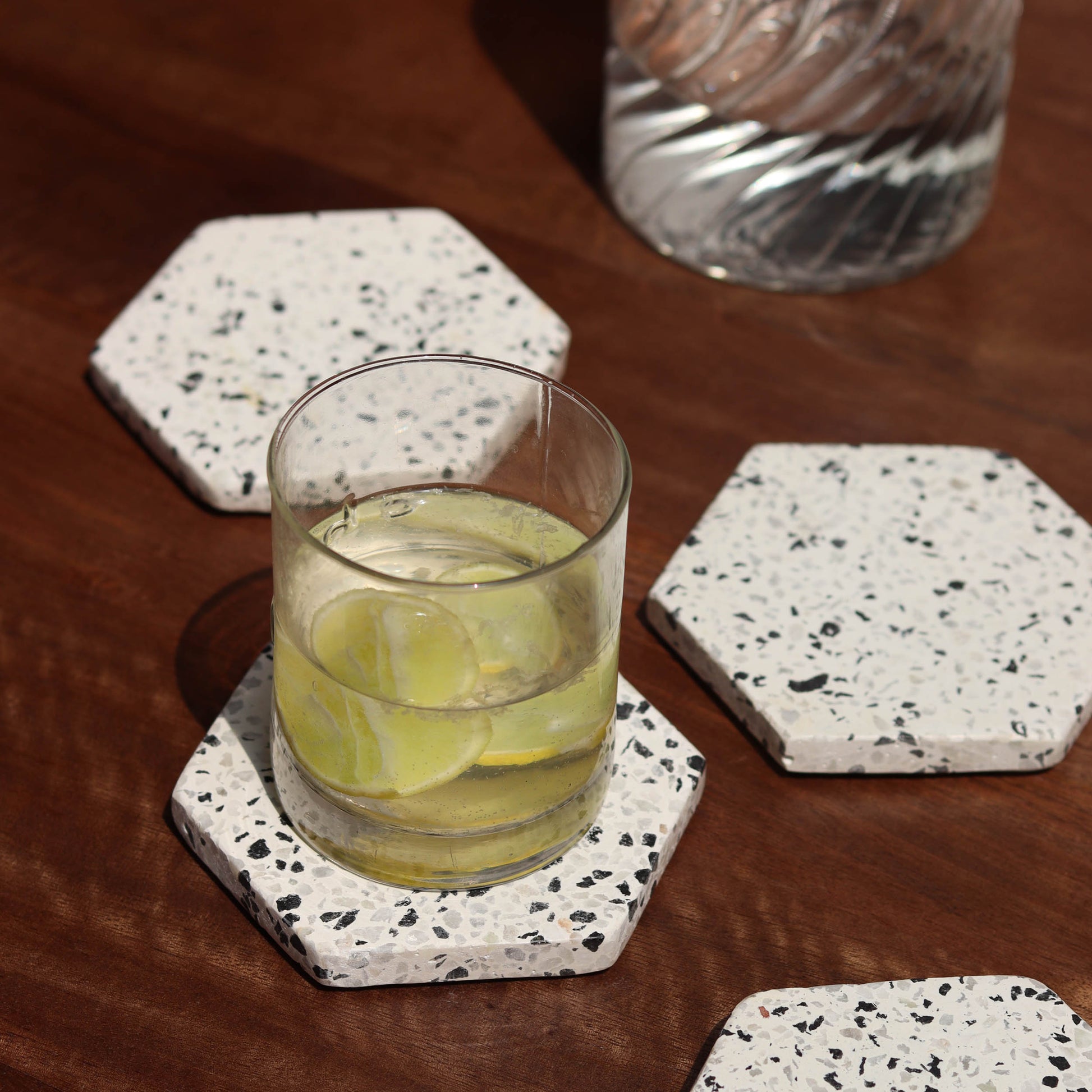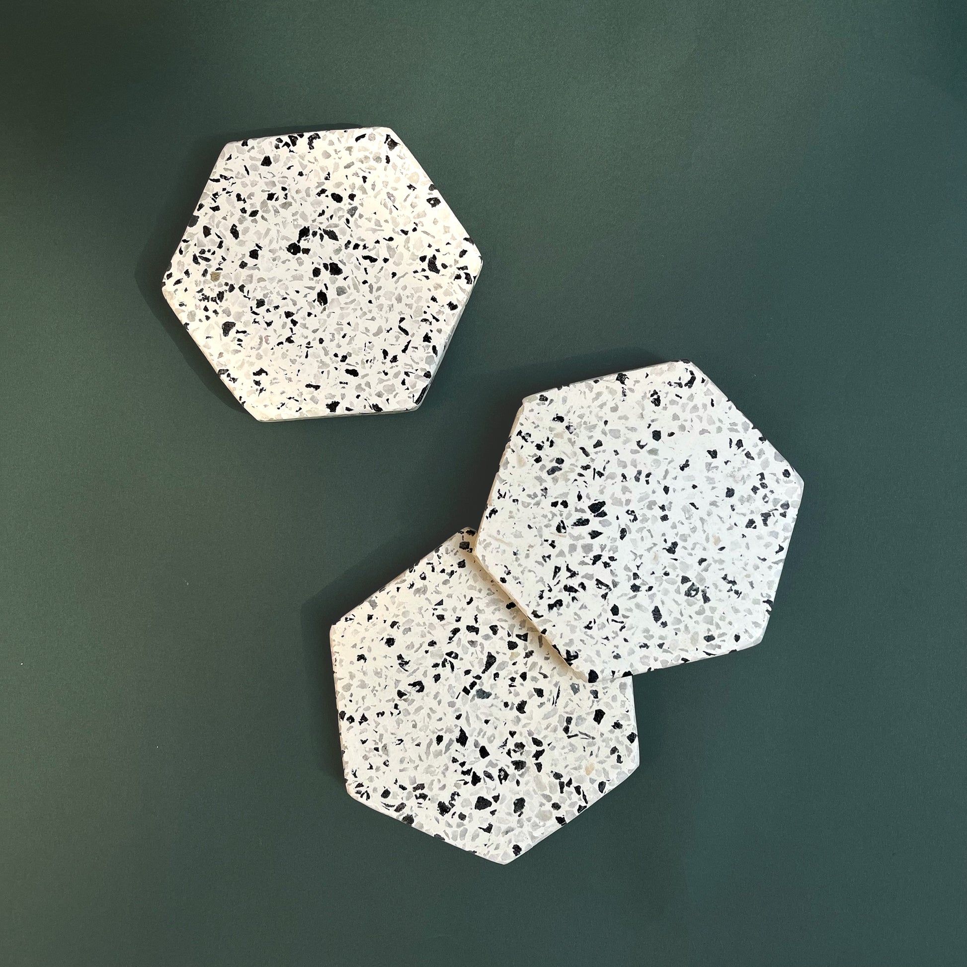 - Elevate your table settings with these hexagon terrazzo coasters, marrying modern design with timeless charm.