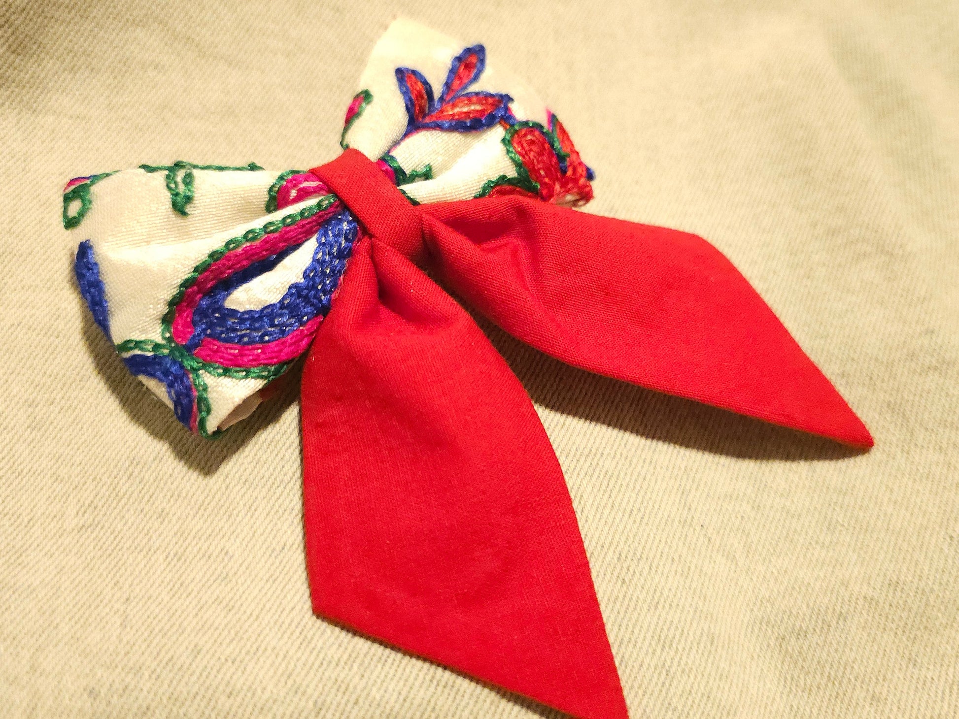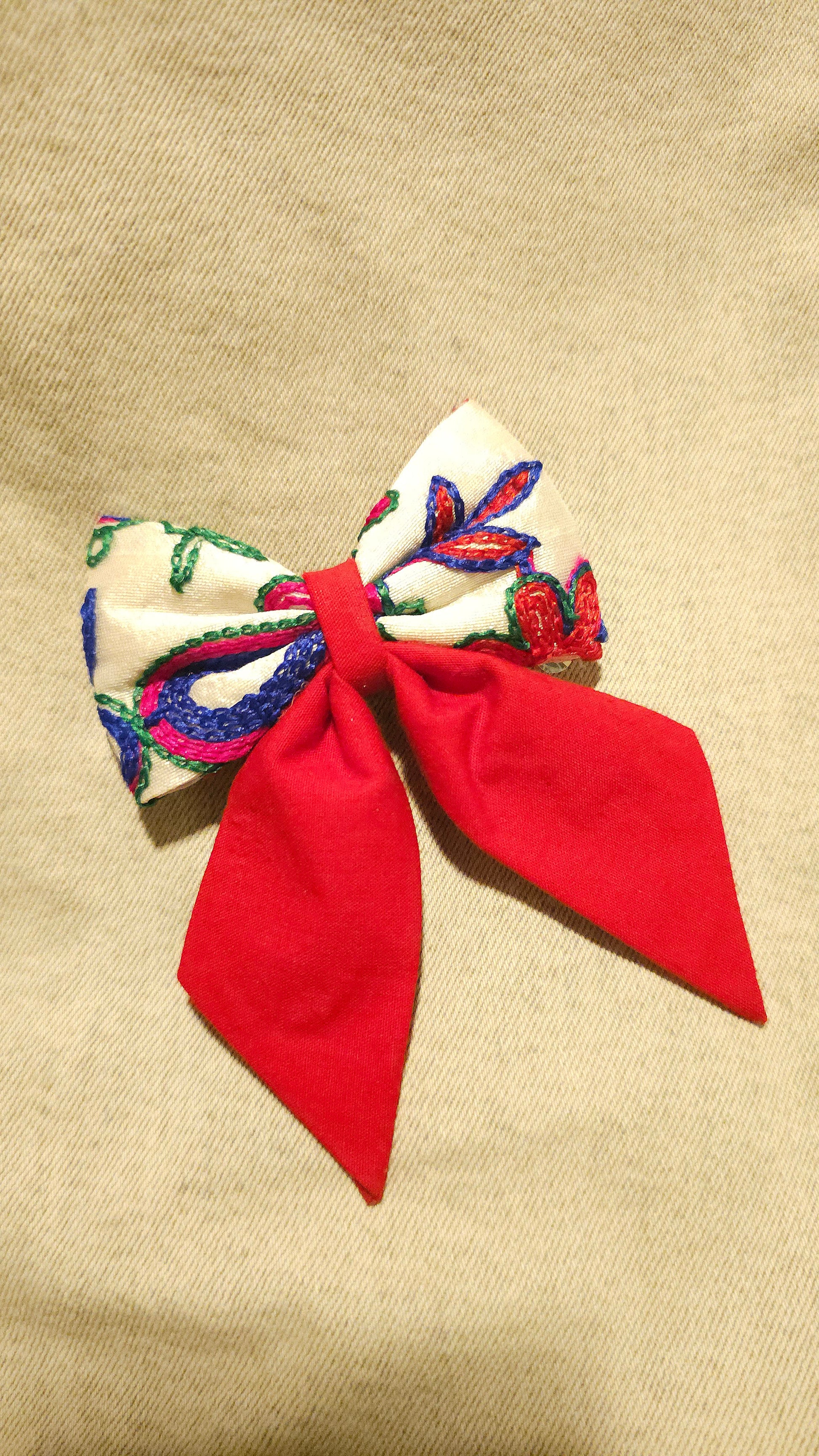 Elegant and eye catching, this ivory bow hair clip features delicate multicolor embroidery accented with bold red tails. Handcrafted with precision, it blends traditional design elements with a modern silhouette, making it perfect for festive celebrations, weddings, or elevating your everyday style. Lightweight and secure, it offers a comfortable fit while adding a pop of color and charm to any outfit.