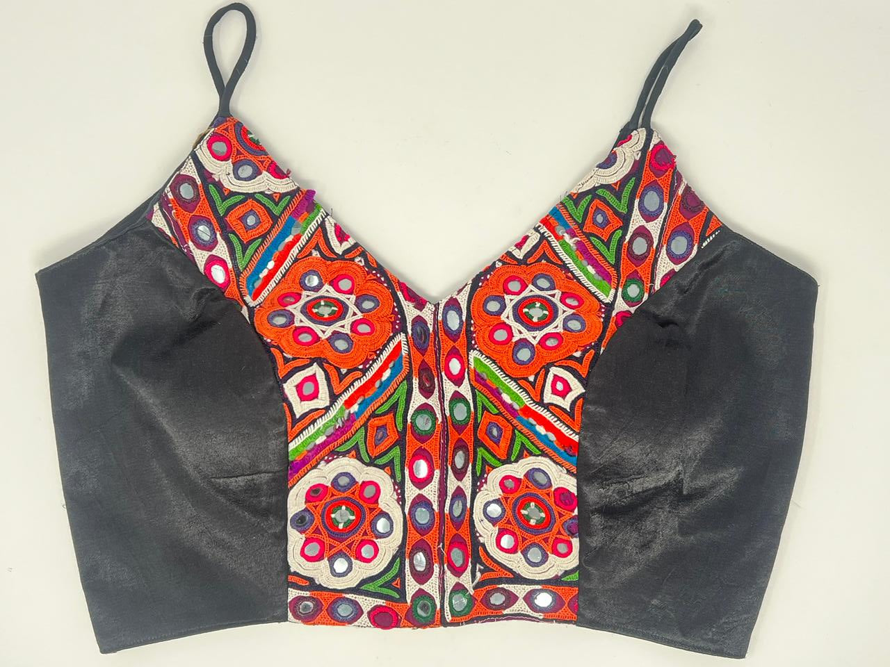 The Kutchi Spaghetti sleeve blouse is a stylish and contemporary garment that combine traditional Kutchi embroidery with modern design , Handmade from vintage embroidery kutchi Patches.