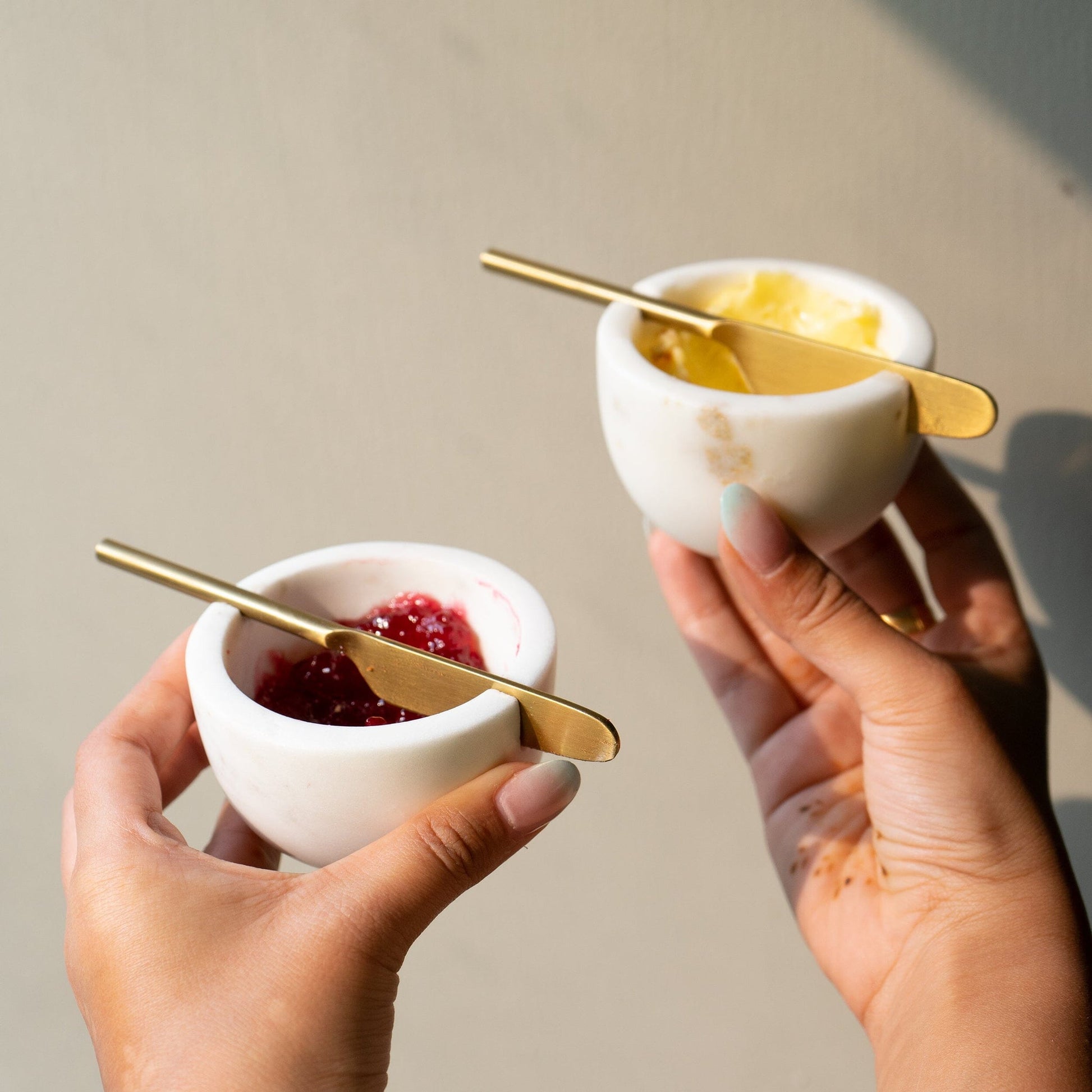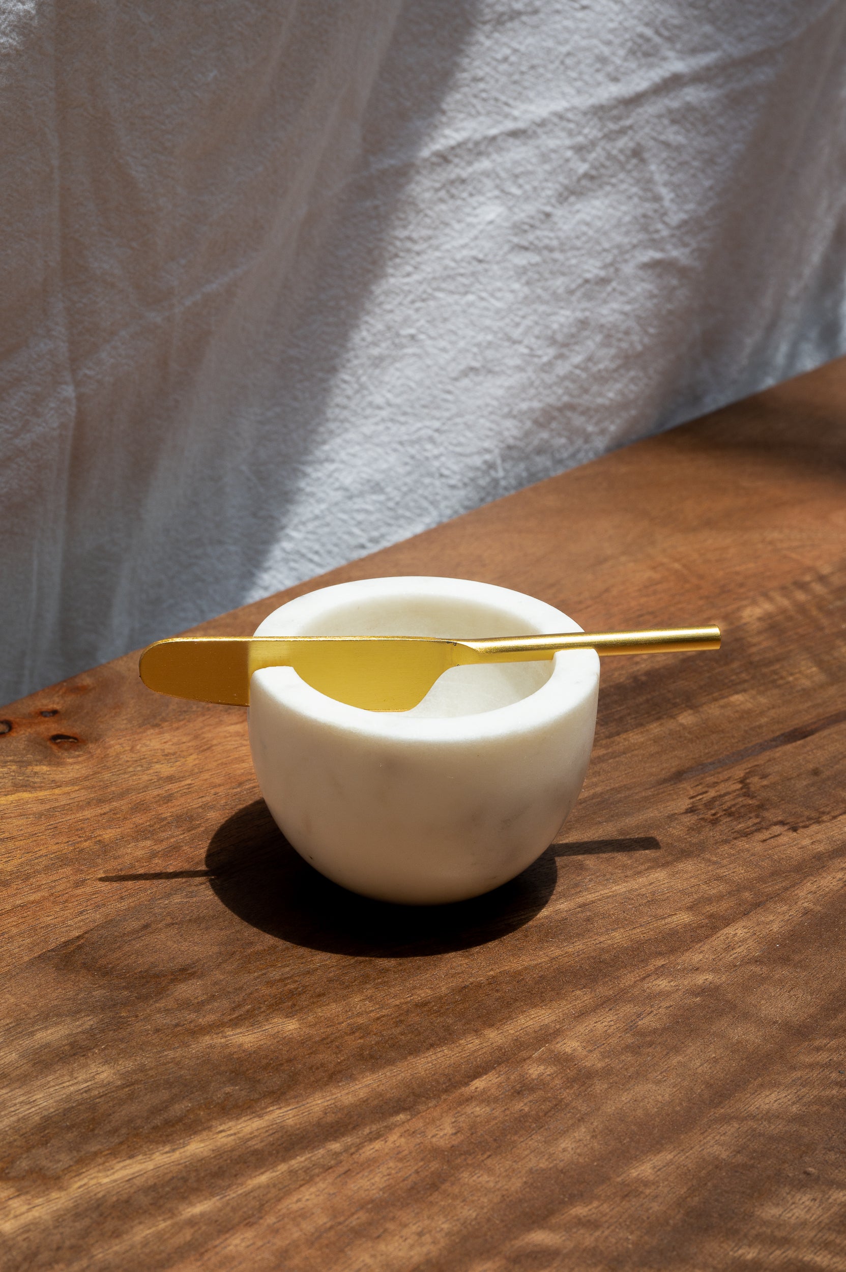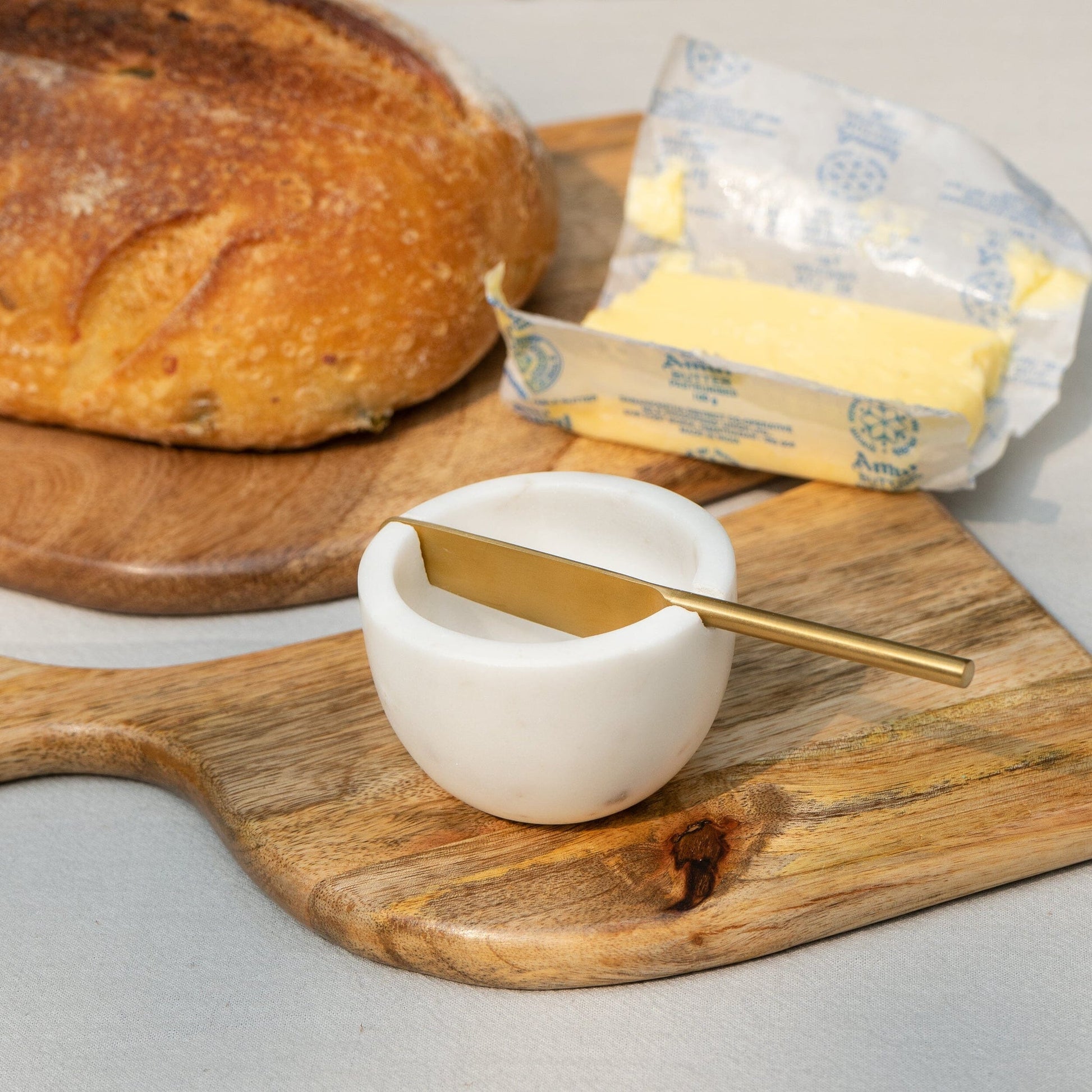 - Crafted out of fine white marble, this butter dish comes complete with a knife that sits neatly atop the bowl.