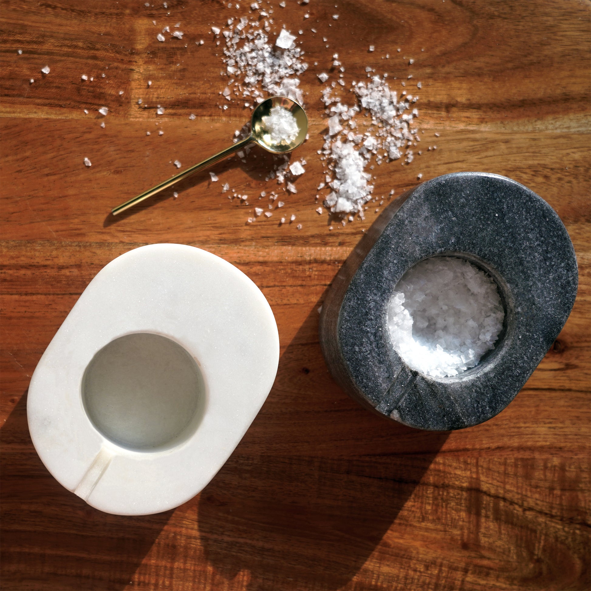 Enhance your culinary experience with this elegant set of two white and grey marble spice bowls.