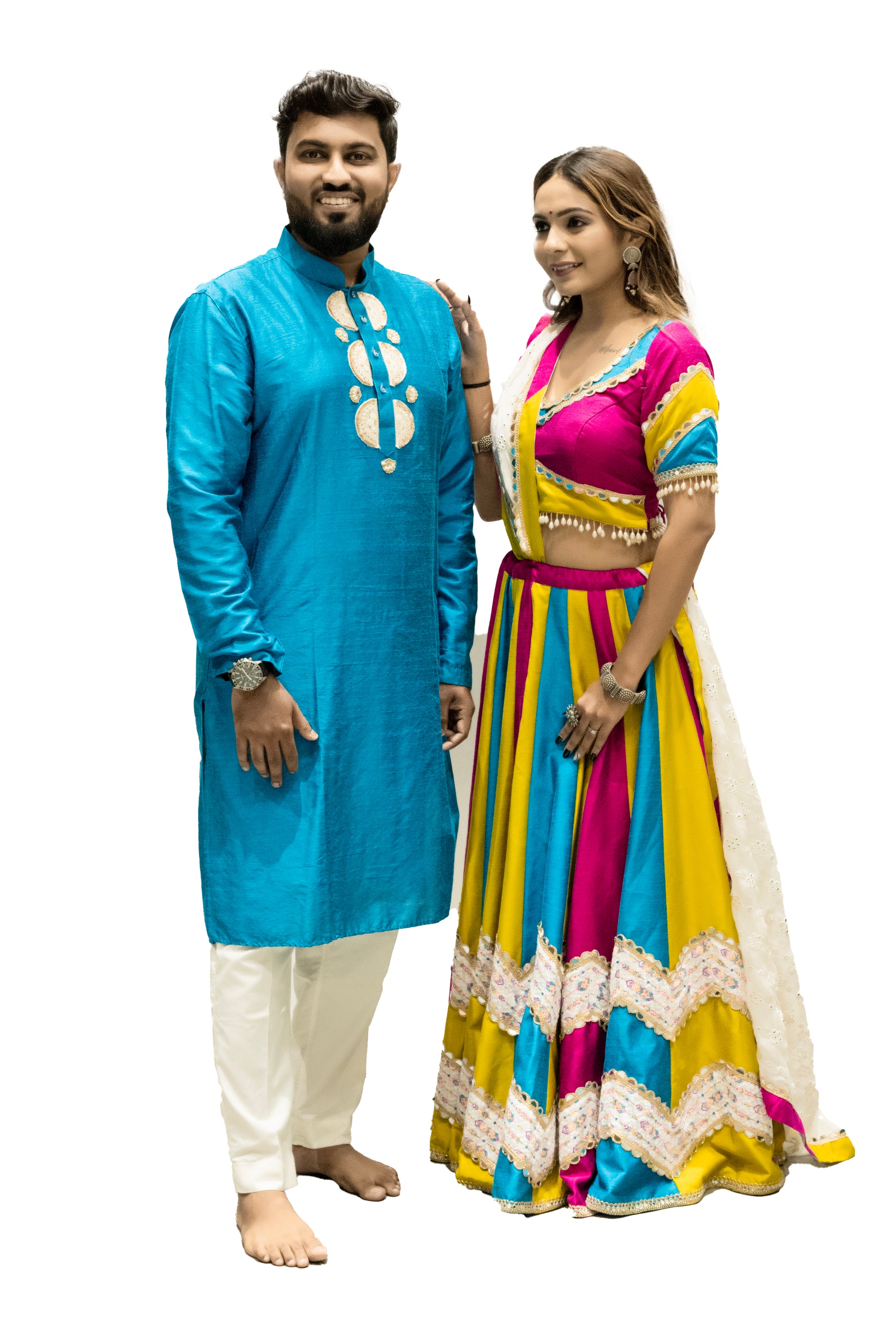 This multicolor chaniya choli is a vibrant celebration of colors, featuring a stunning blend of red, yellow, and blue.