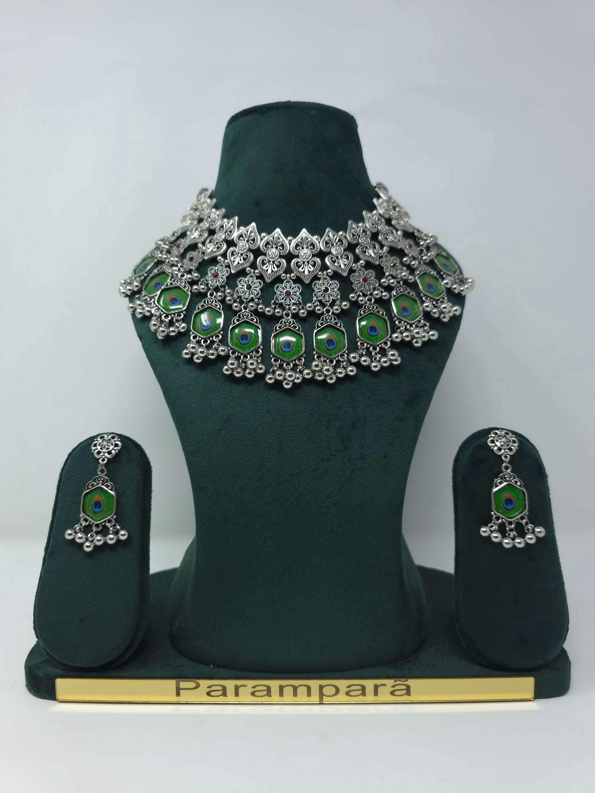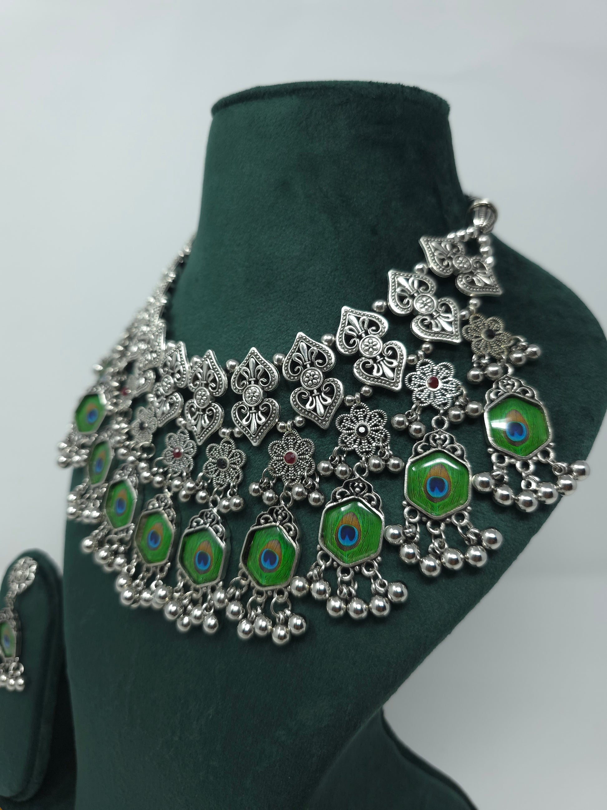 Channel timeless beauty with this oxidized silver necklace set, adorned with striking peacock feather motifs painted in brilliant green and blue enamel. The wide choker style design features layers of ornate floral engravings and intricate detailing, crowned with silver ball clusters that add movement and festive charm. Paired with matching drop earrings, this set makes a bold statement for Navratri nights, temple ceremonies, or traditional celebrations. It beautifully complements sarees, lehengas, and embroidered blouses with a touch of heritage flair.