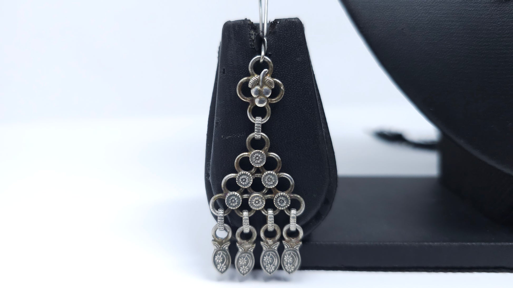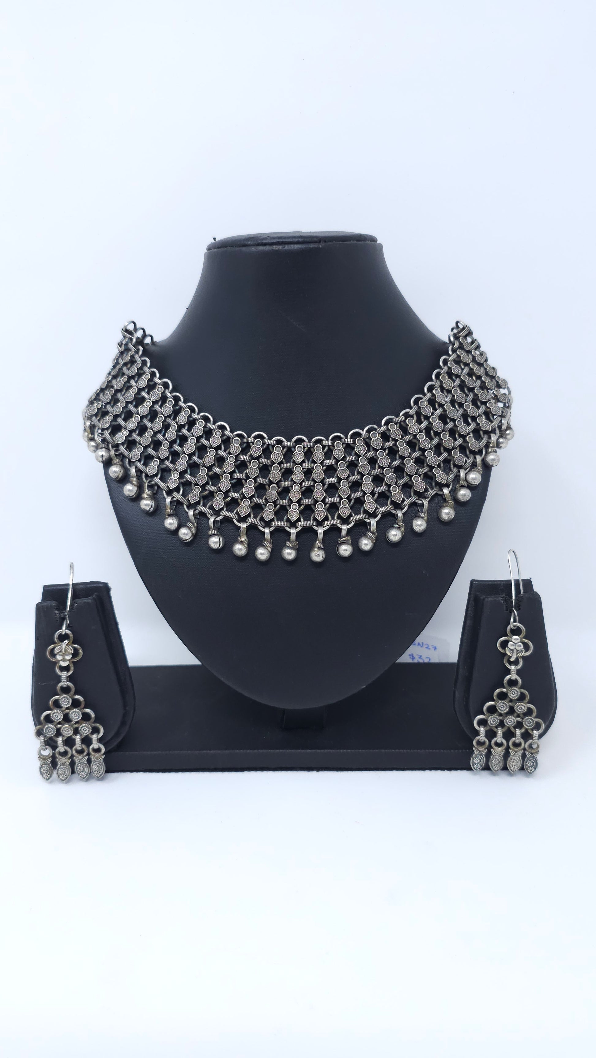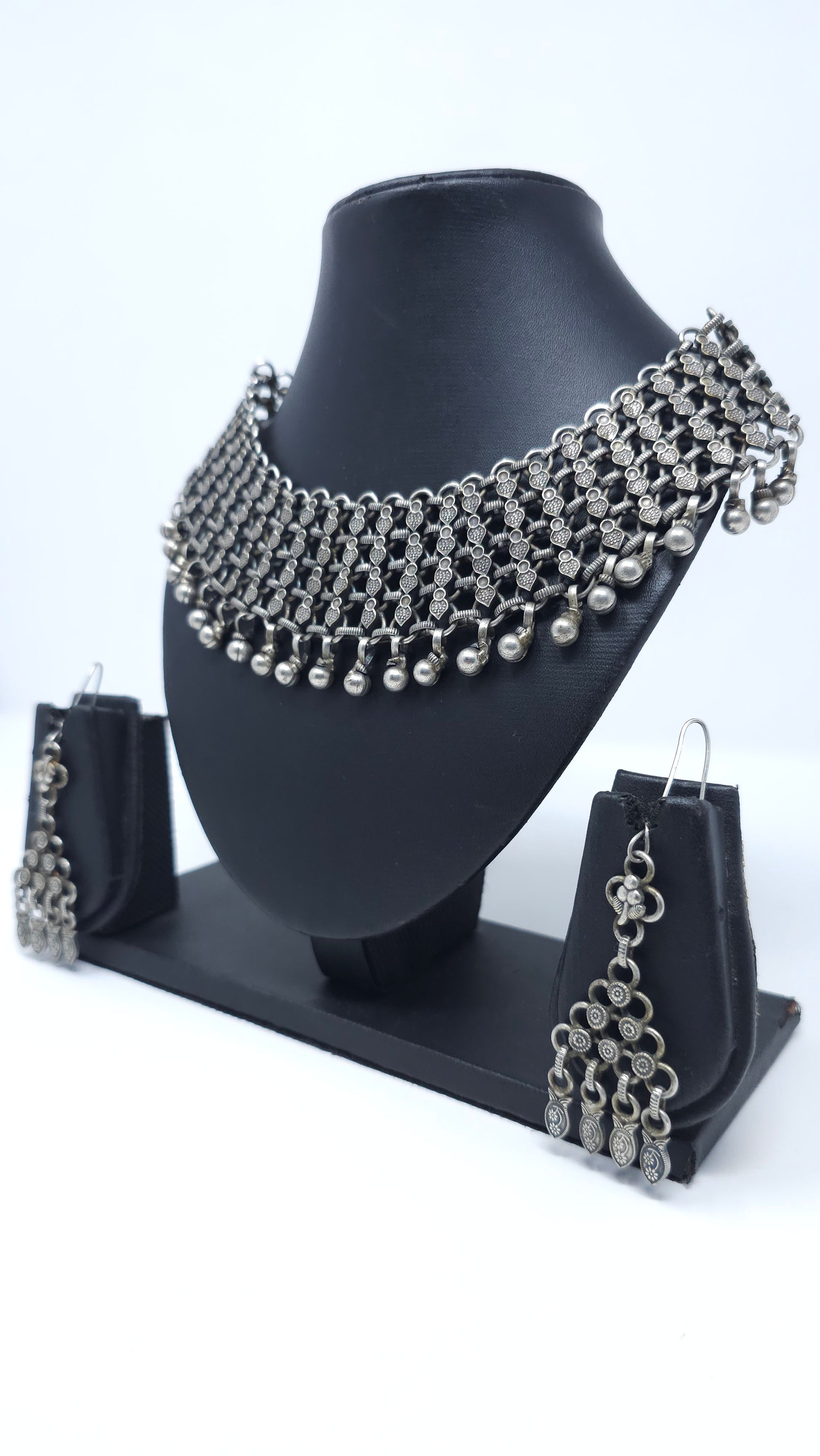 Intricate oxidized choker with lattice inspired design and ghungroo edging, paired with elongated matching earrings for a royal Navratri look.