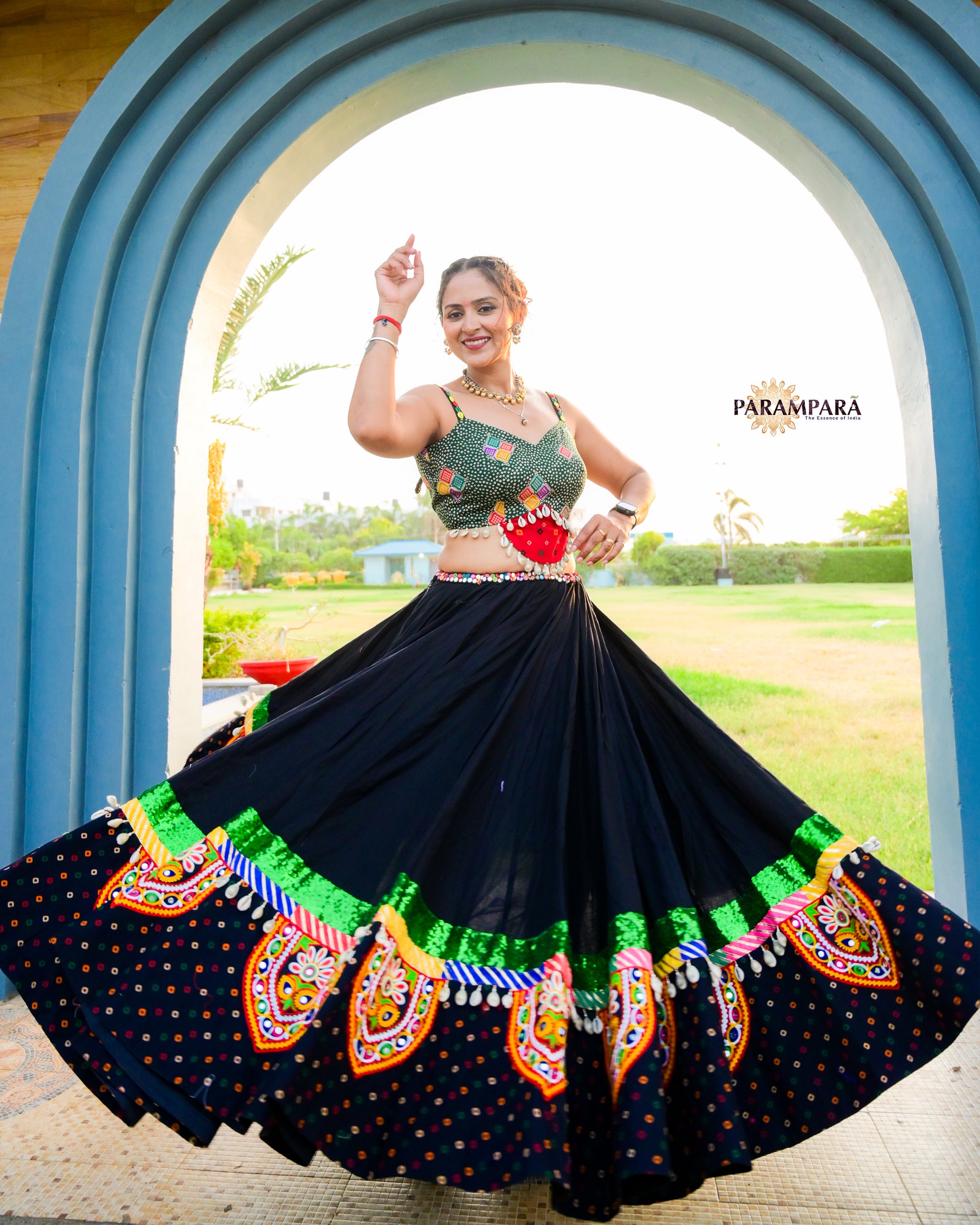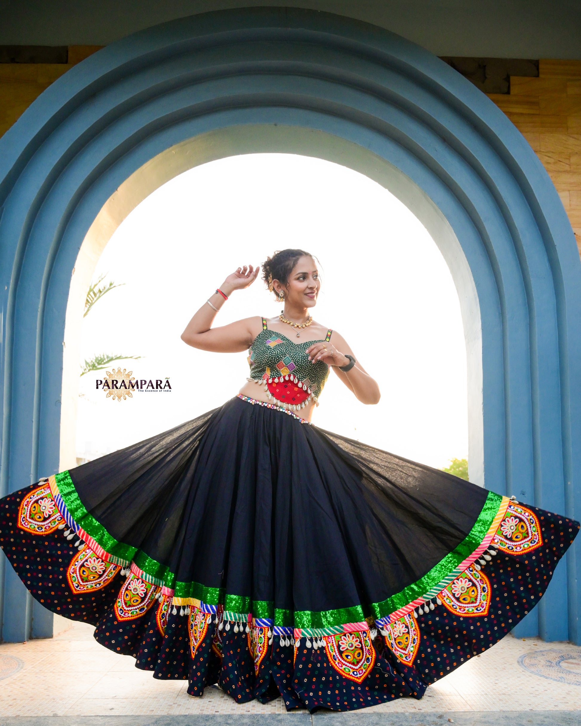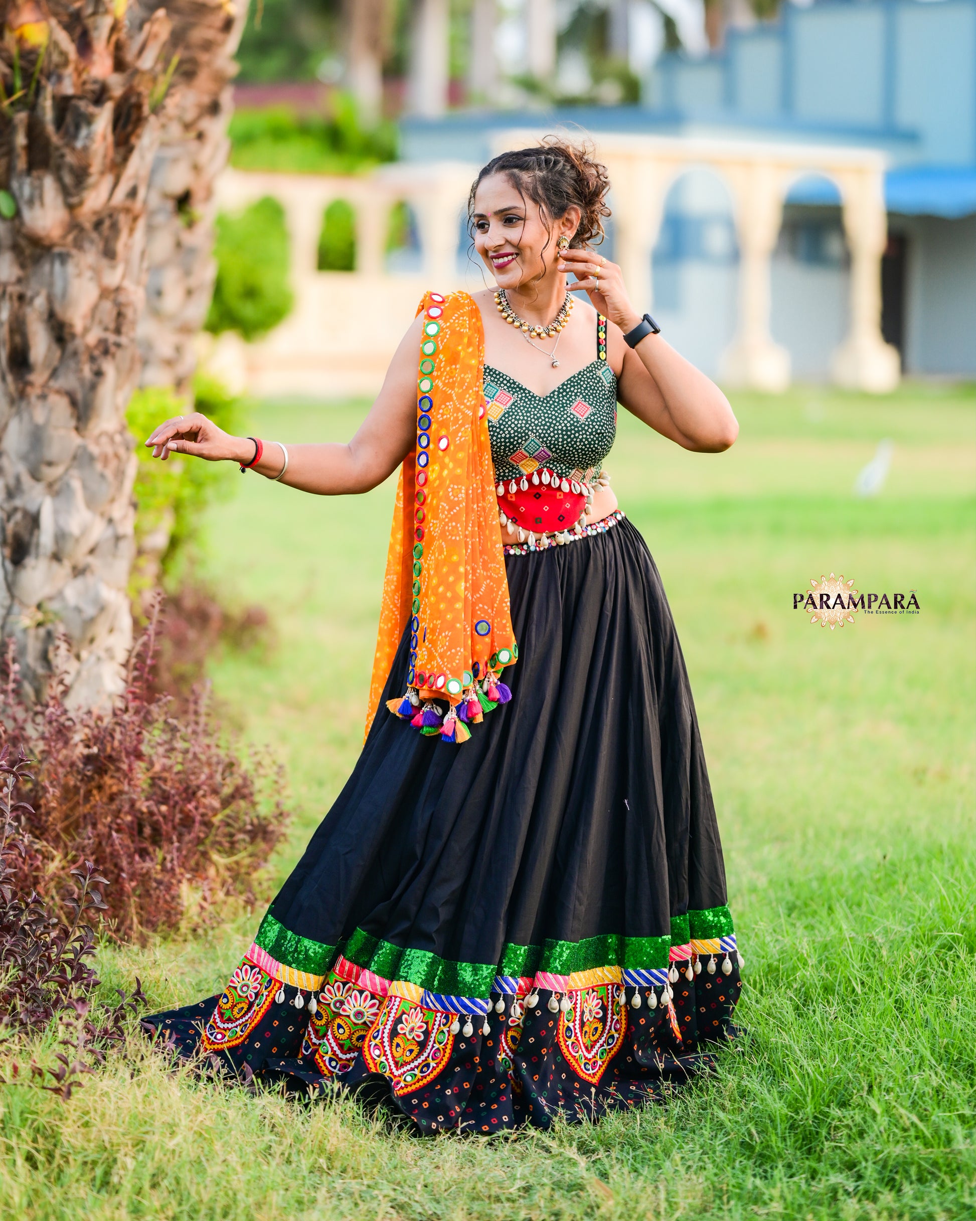 Black Chaniya choli with black bandhani border.