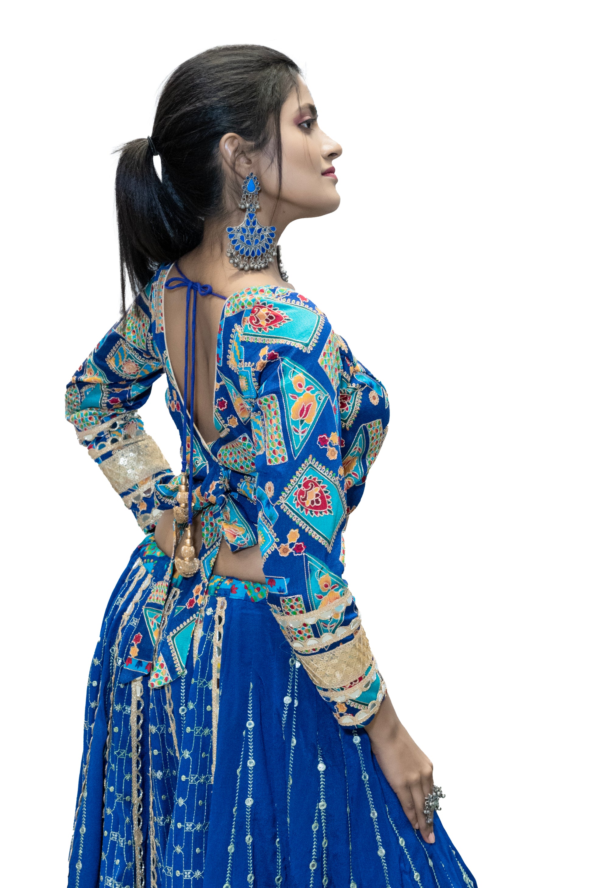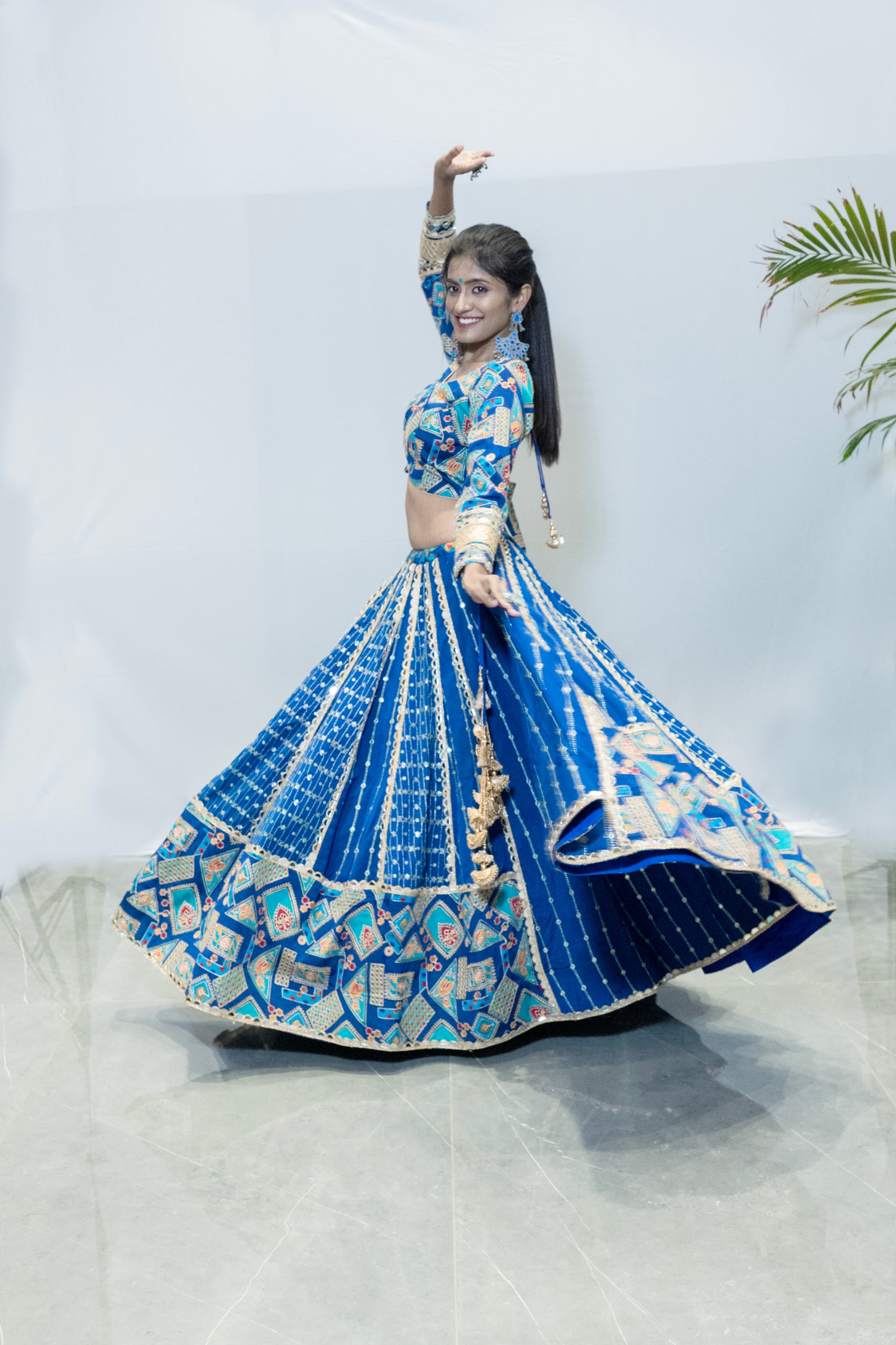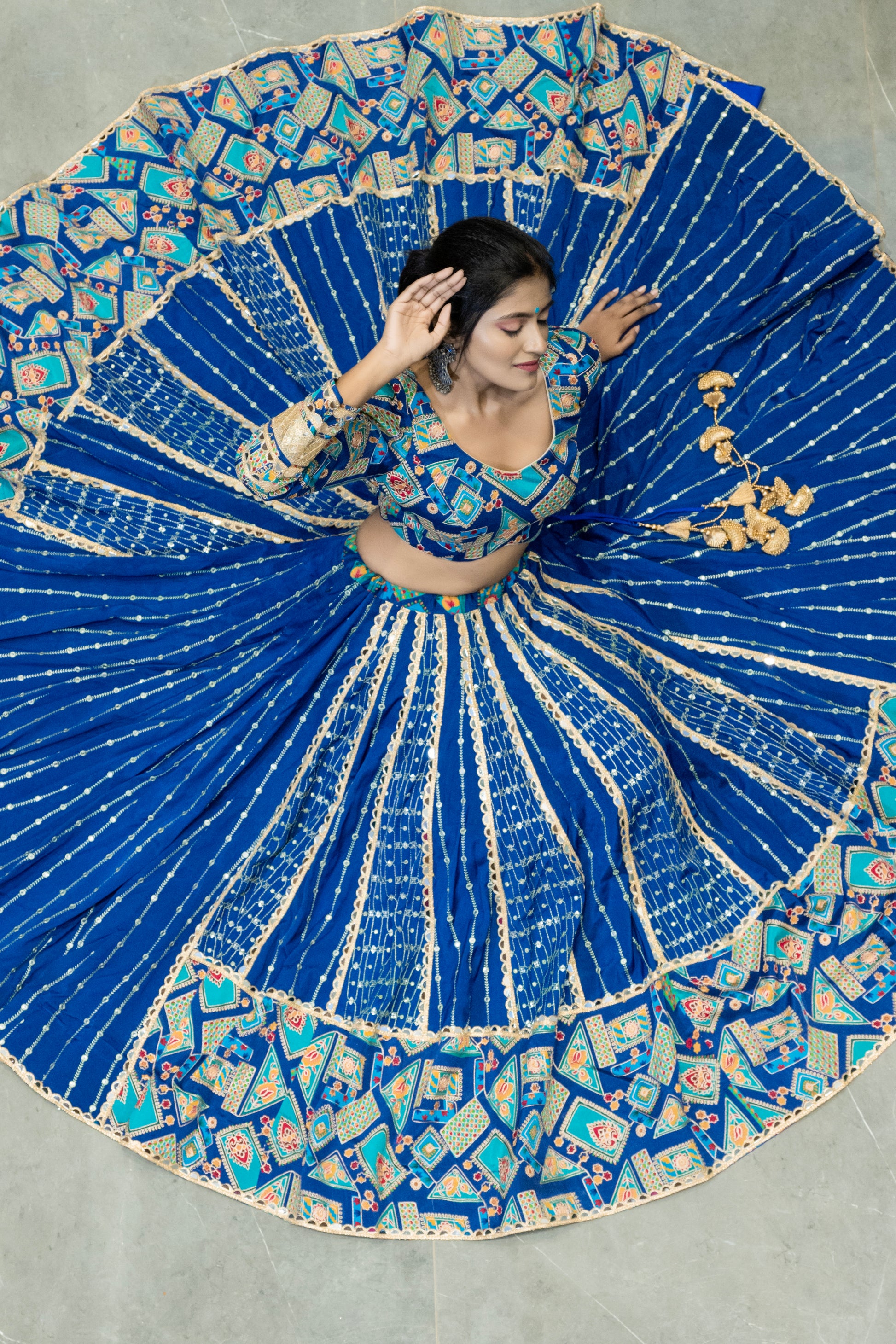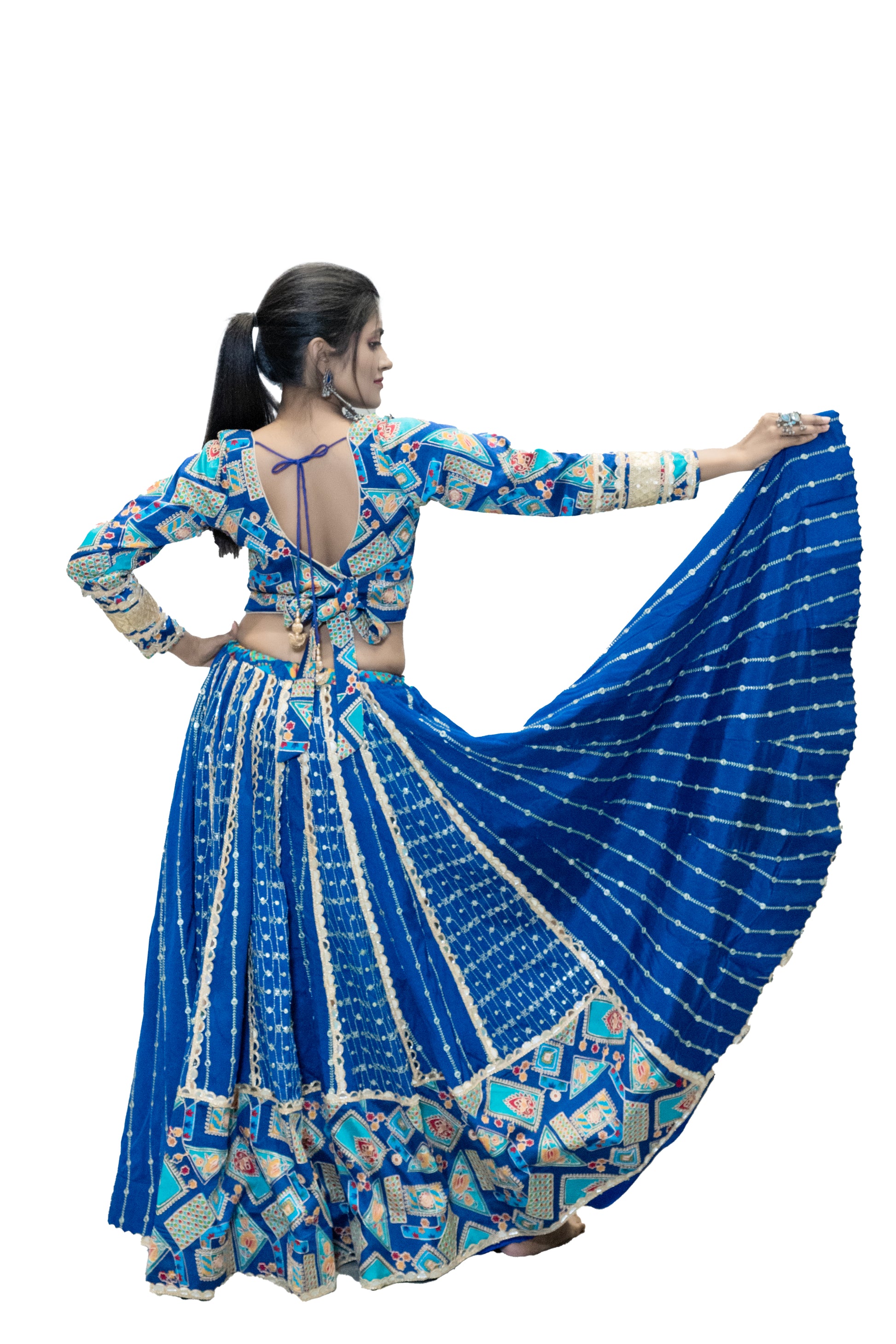 The vibrant blue Chaniya Choli is a stunning showcase of traditional artistry and modern elegance