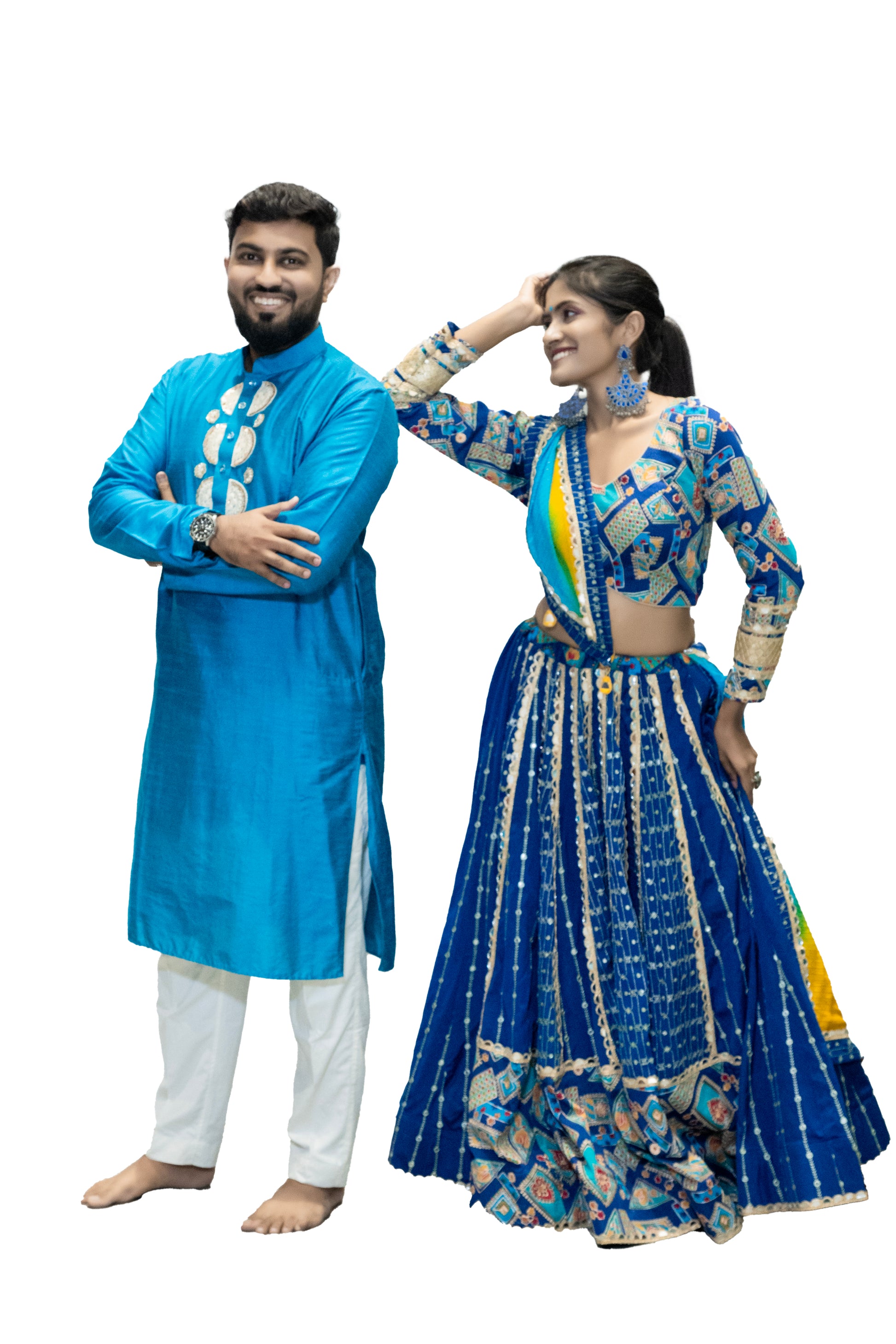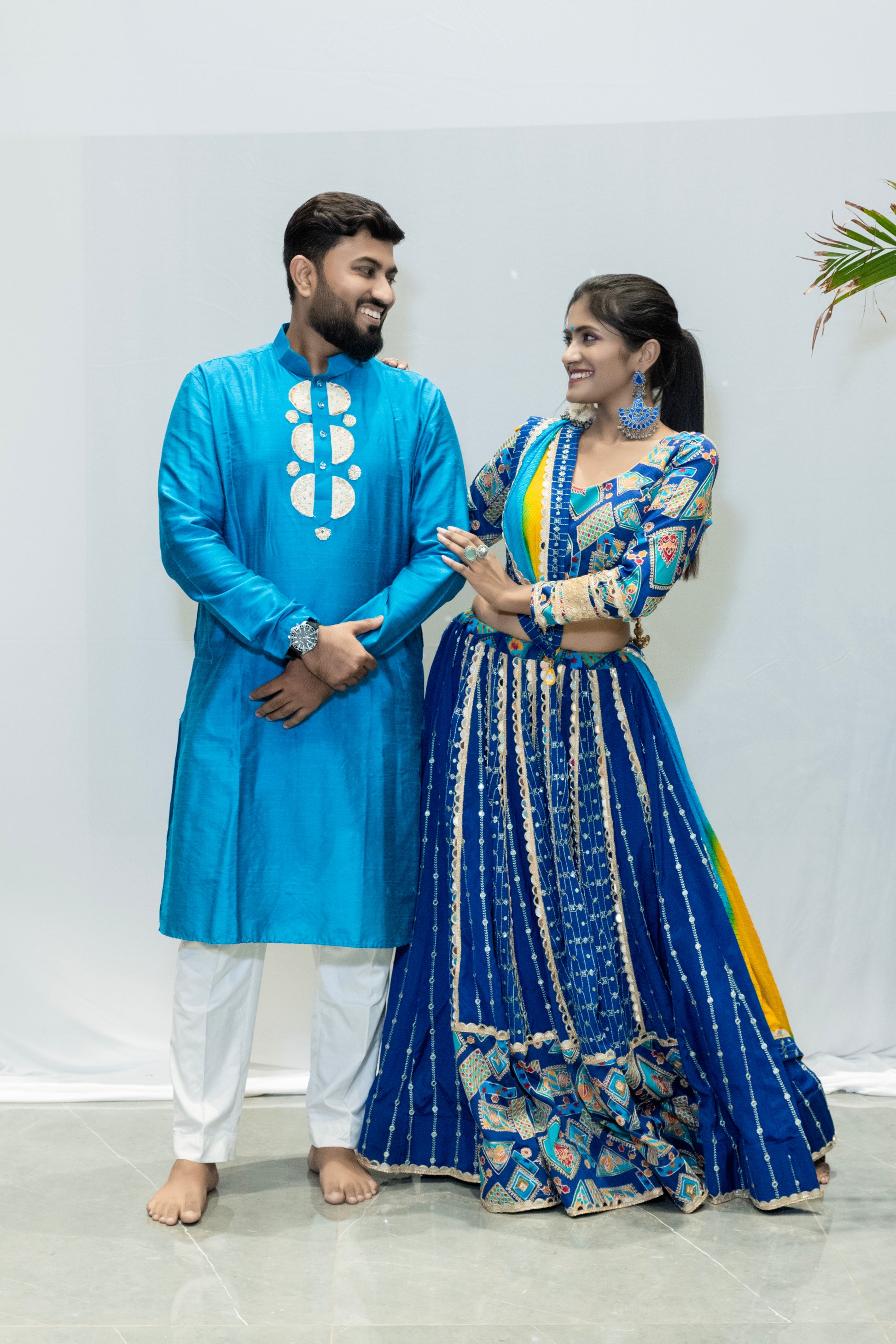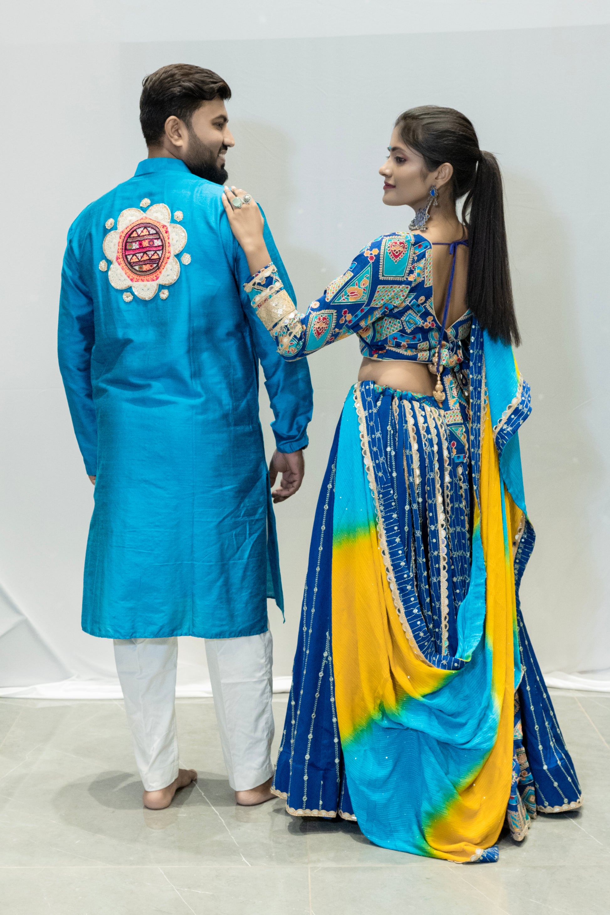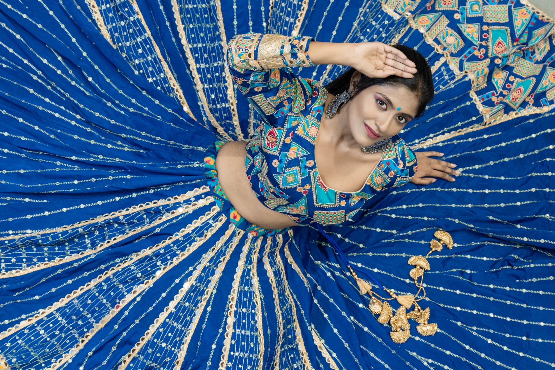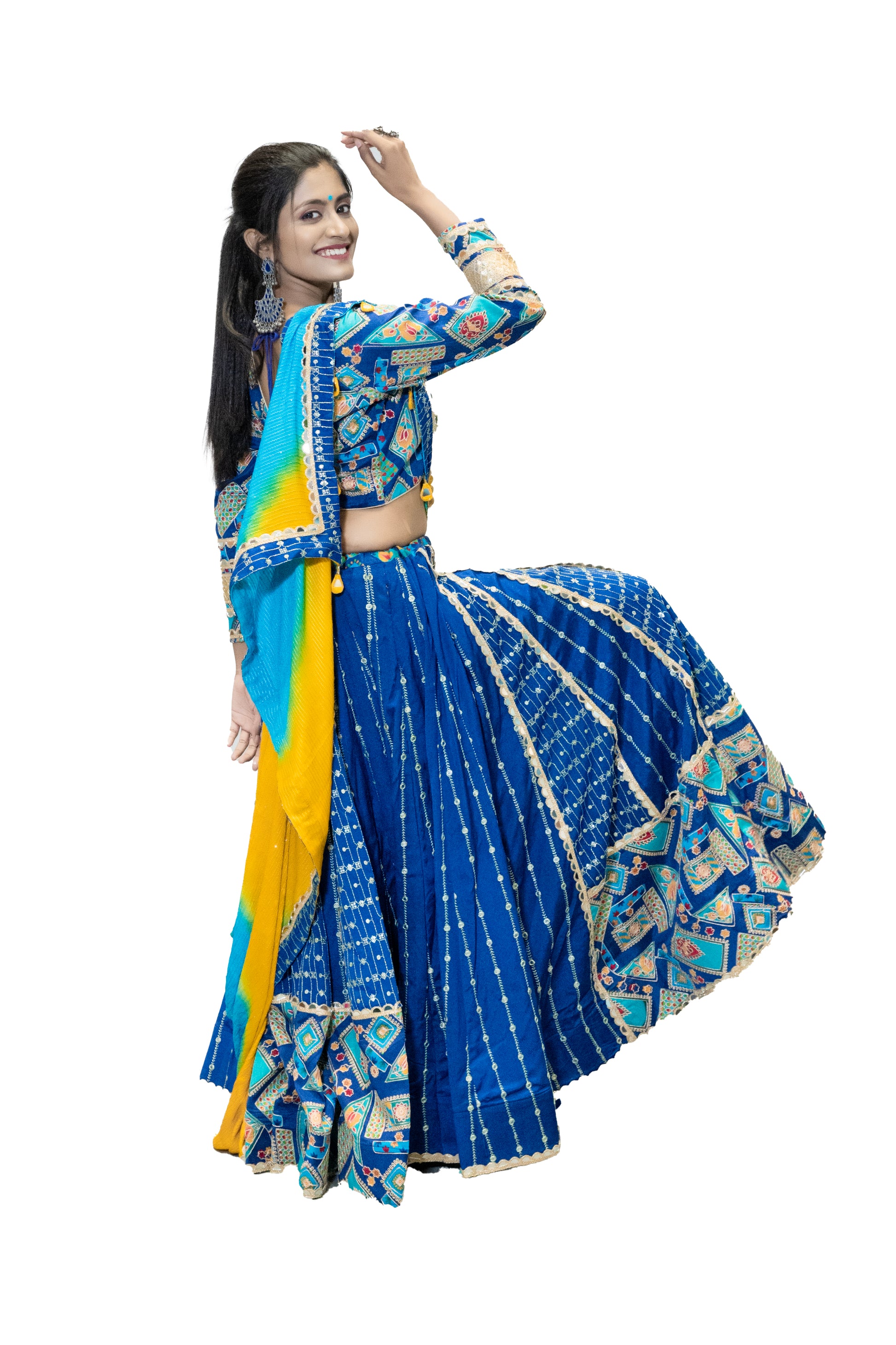 The vibrant blue Chaniya Choli is a stunning showcase of traditional artistry and modern elegance