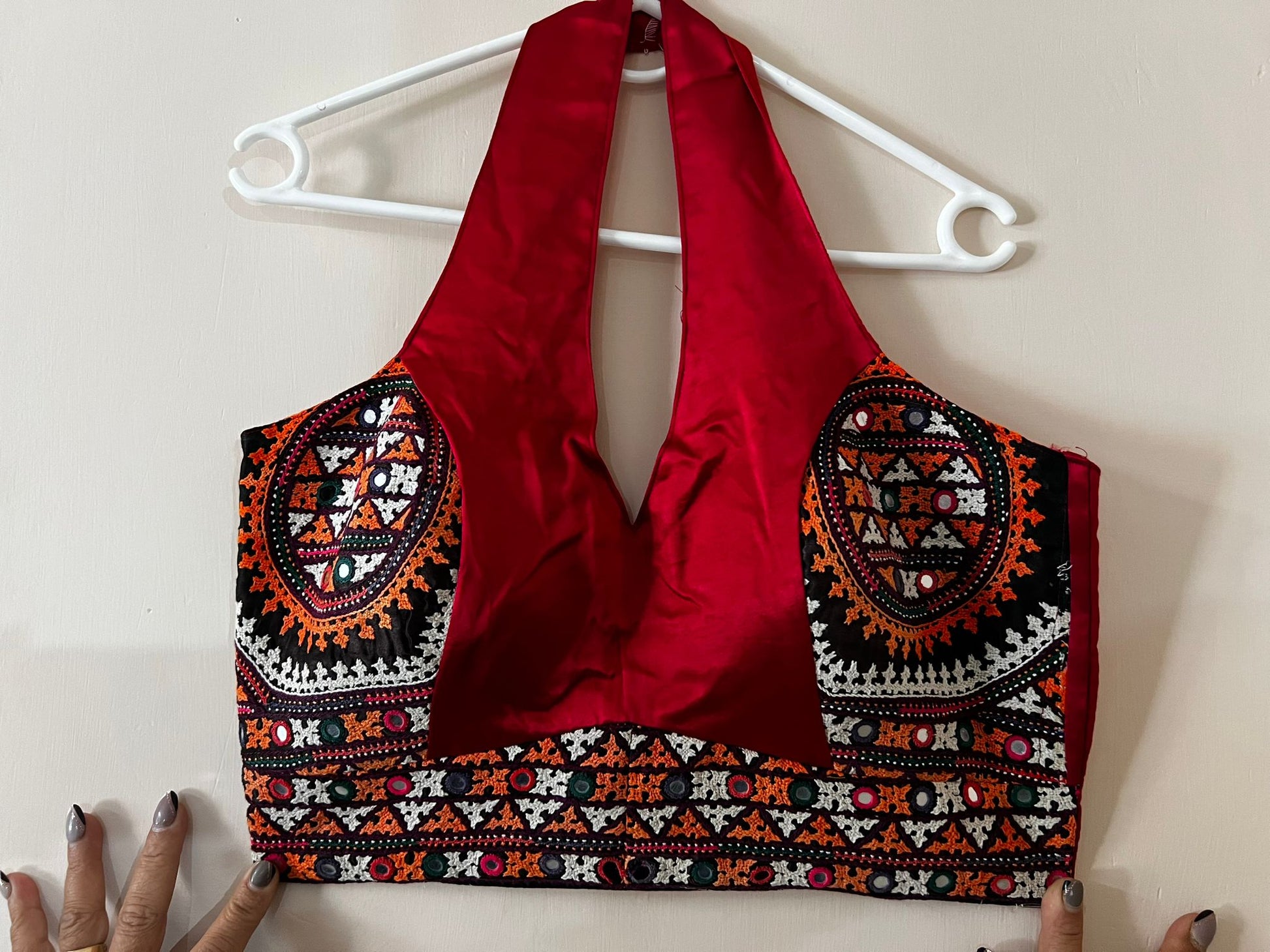 This blouse is designed using hand embroidered Kutchi patches that were created 50 years ago in a remote village of Gujarat, India.