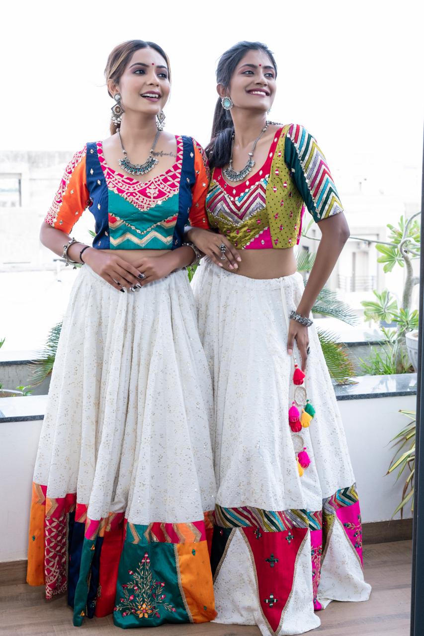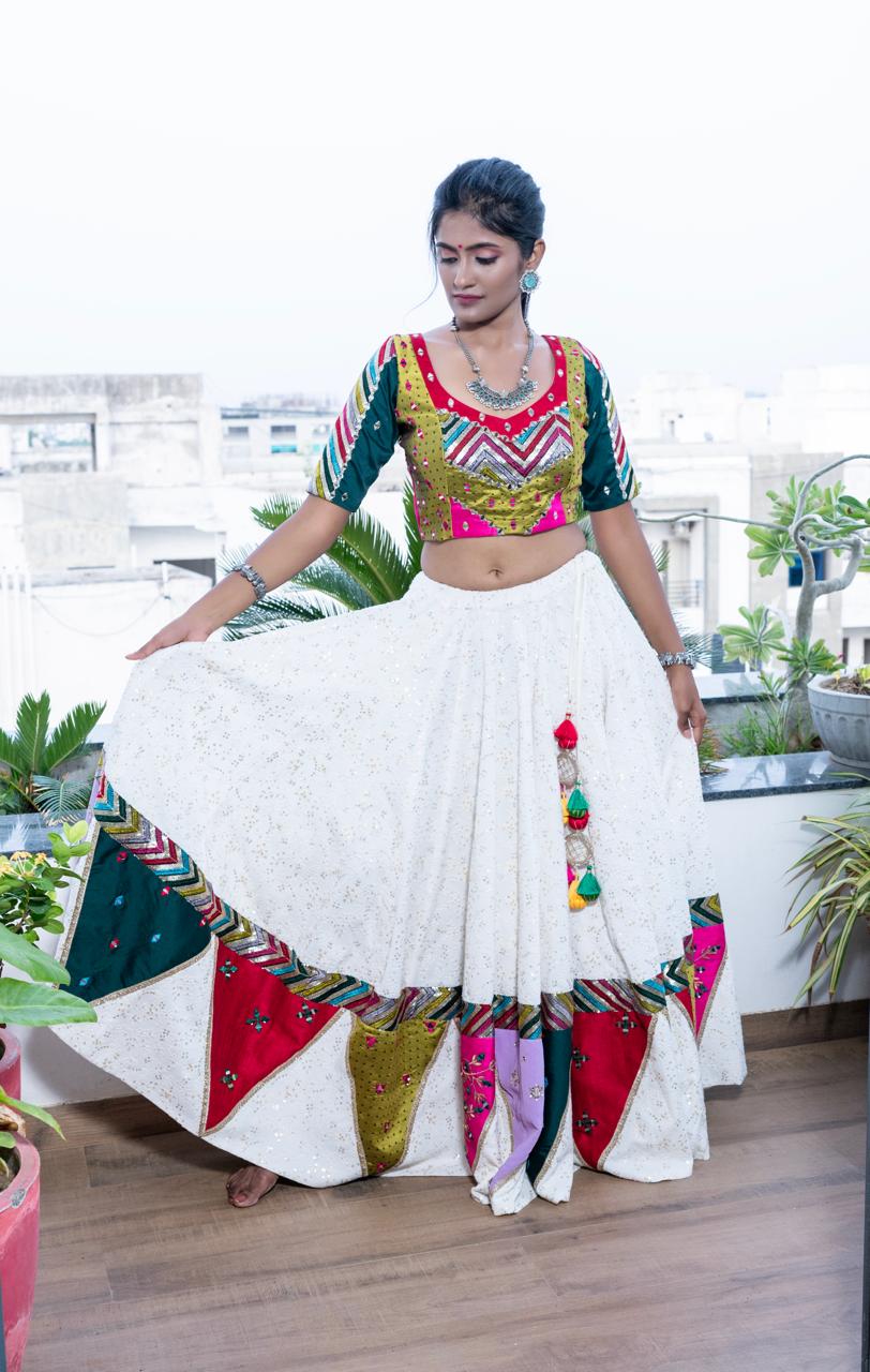 The choli features a broad multicolor border, which beautifully contrasts with the white fabric, infusing it with vibrant hues and a festive flair.