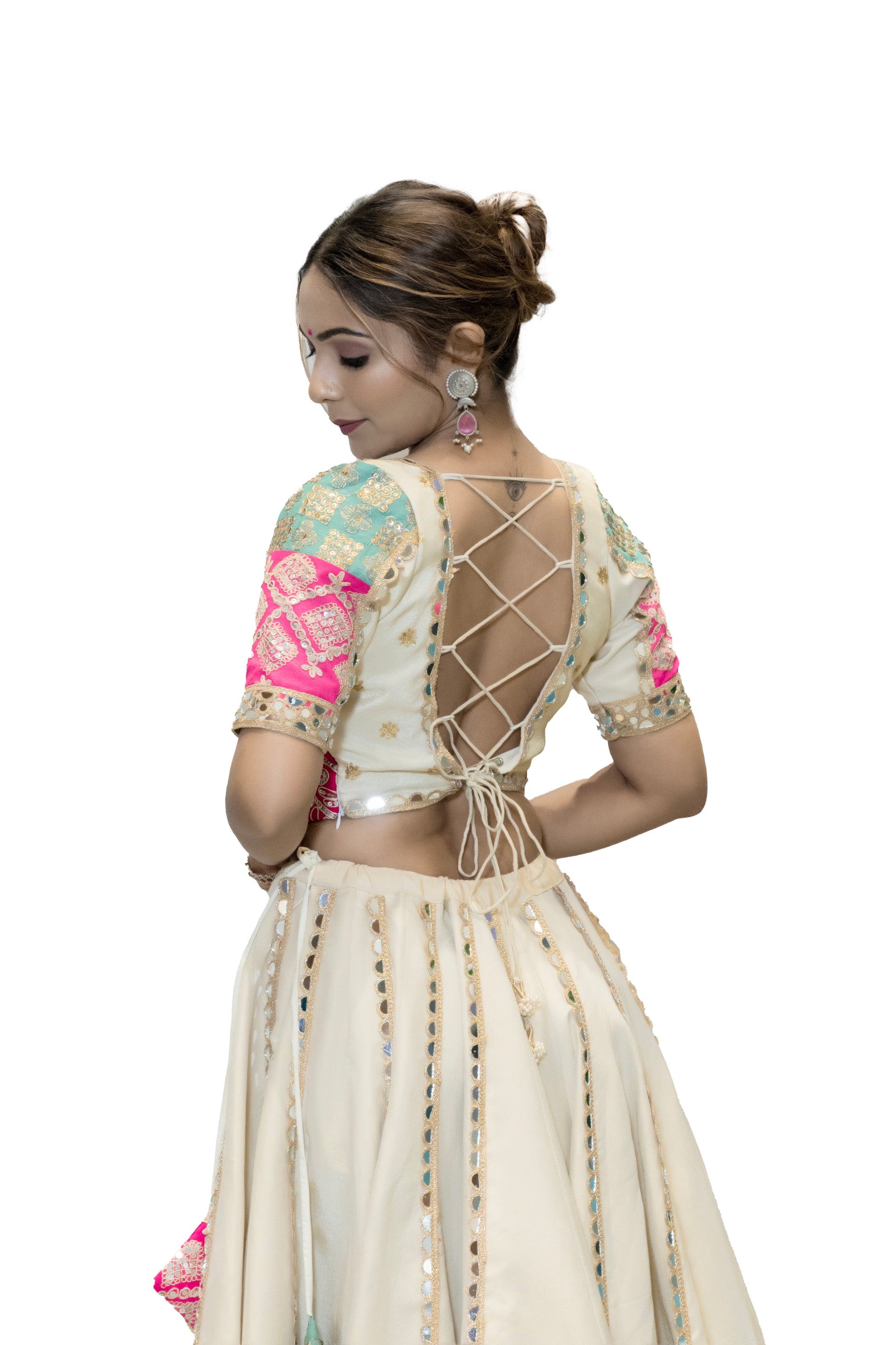 The blouse is made of base white color with Rani pink and light green art work done on both sides of sleeves perfectly matching the chaniya.