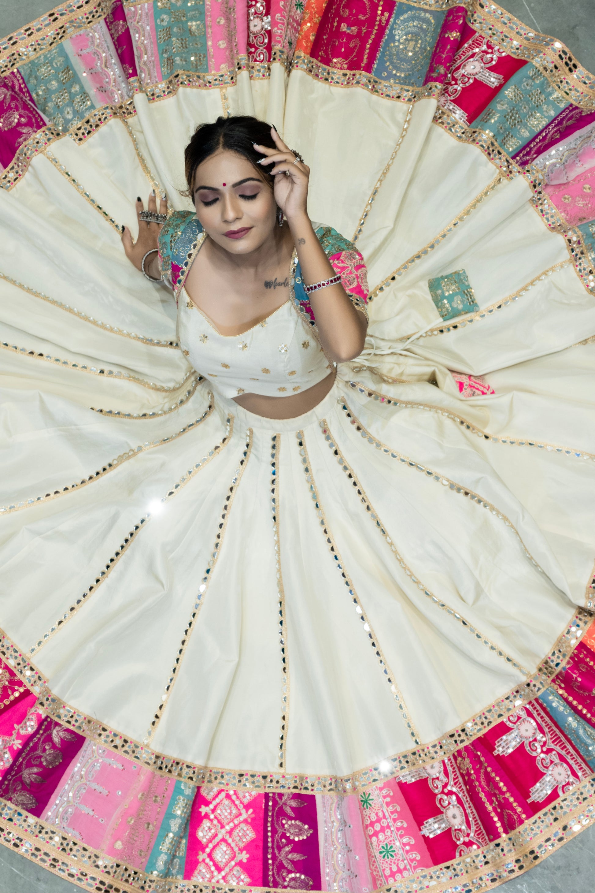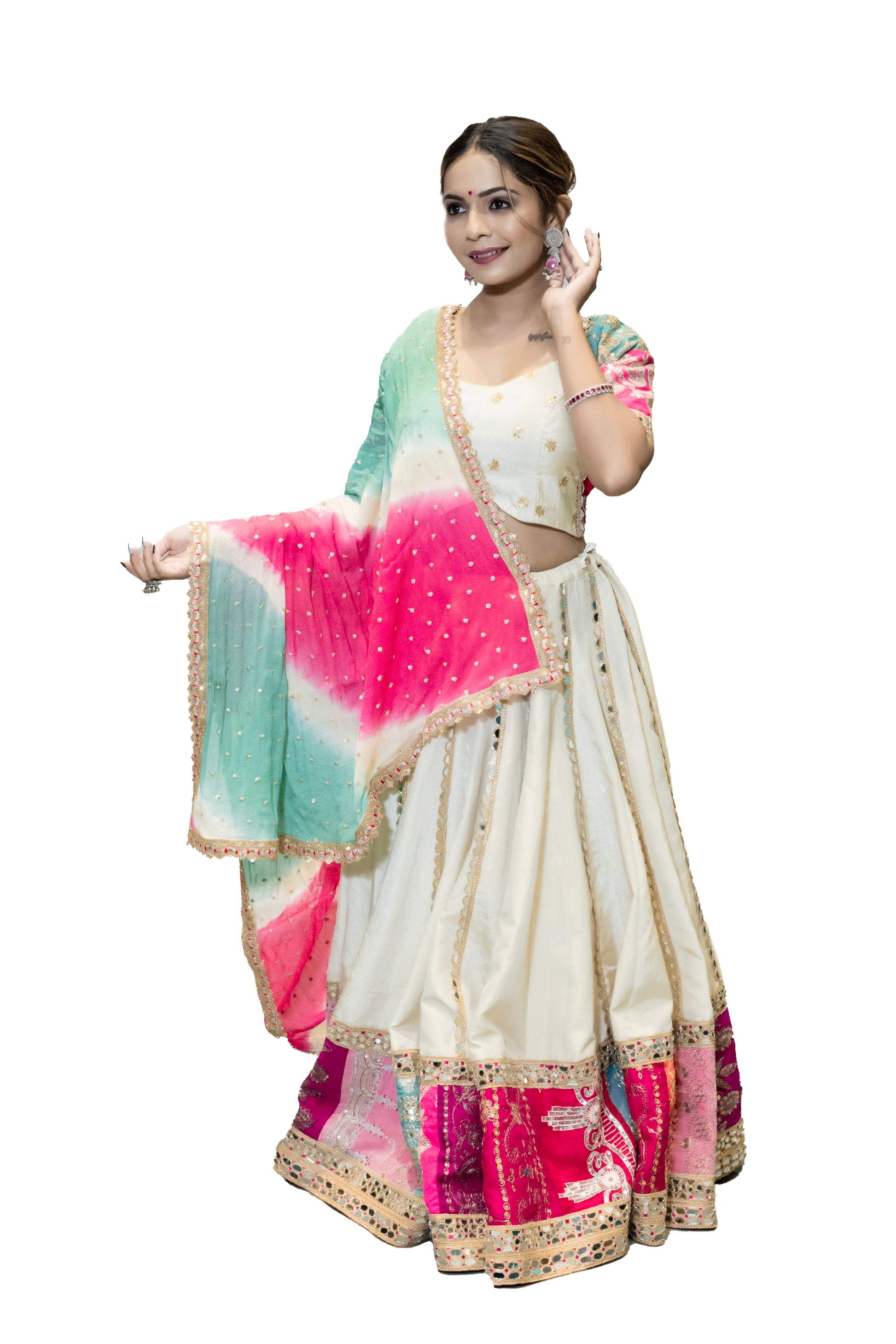 Beautiful White base chaniya with multicolor broad tikki work done in Geometric and Floral design at bottom side of chaniya.