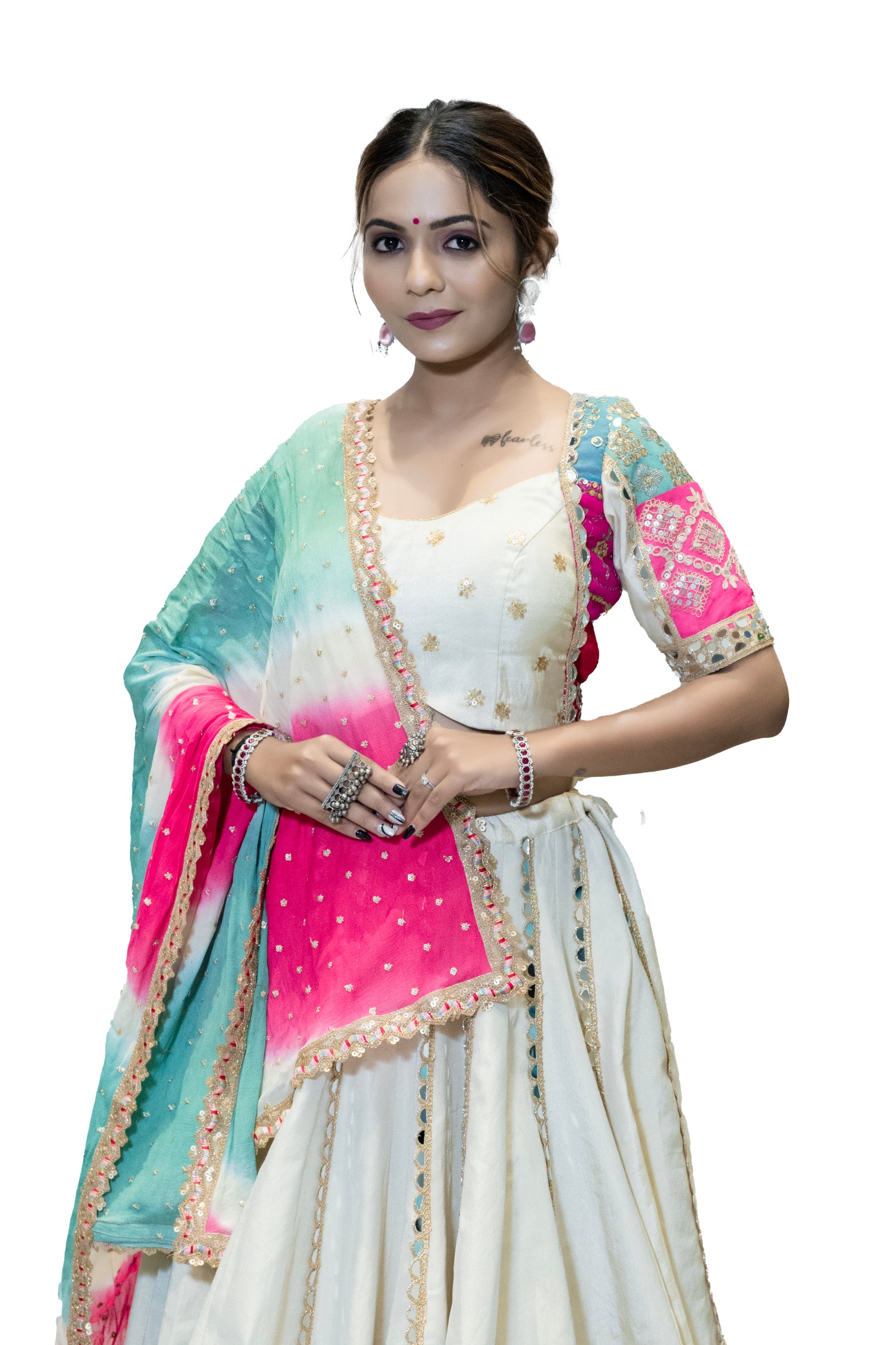 The blouse have flower design Tikki work on it perfectly complementing the over all elegant look of chaniya choli.