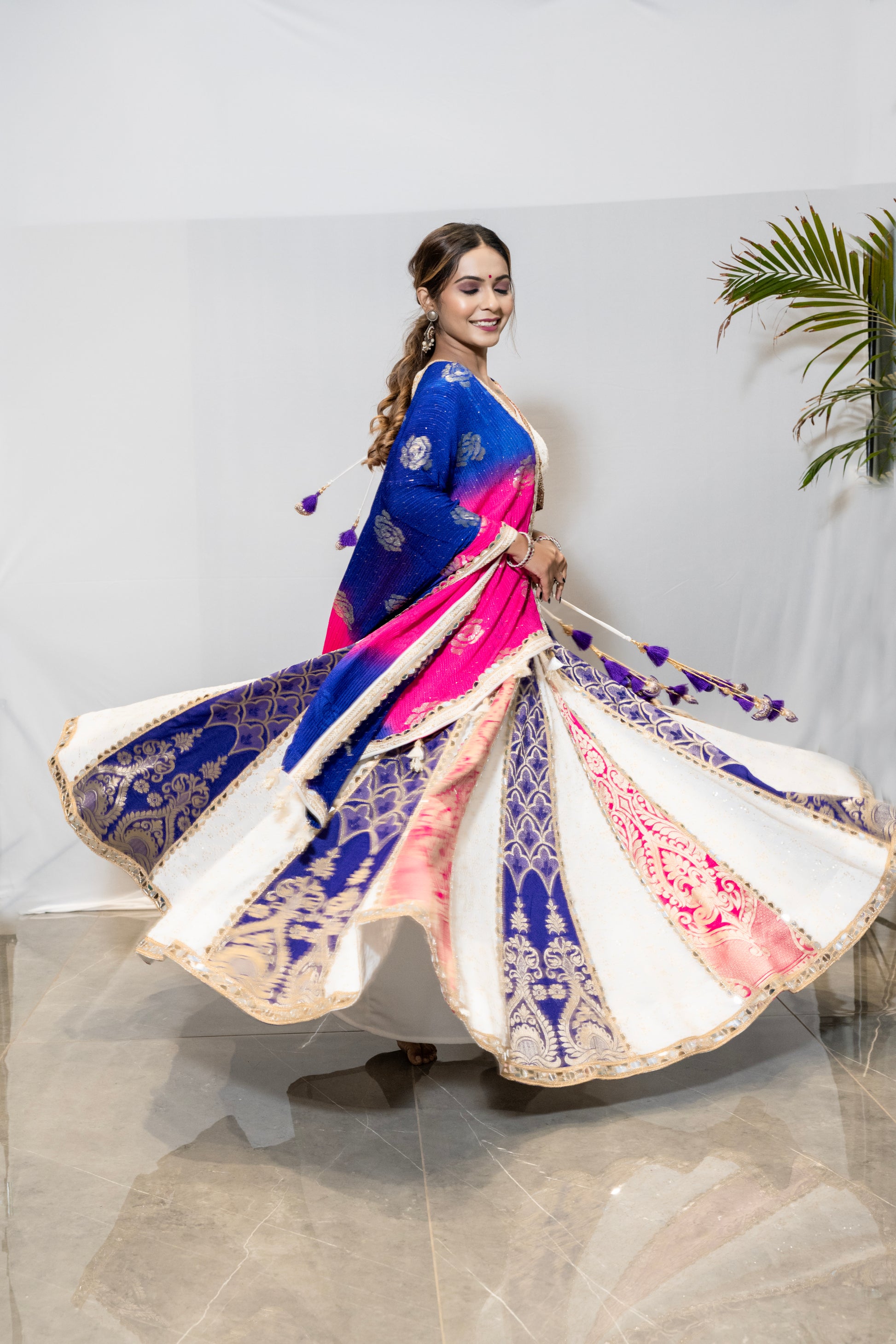The dupatta is made of Blue and Pink with mirror work on edges along with handmade tassel at pallu side with complements perfectly with colors of chaniya choli, it have floral design.