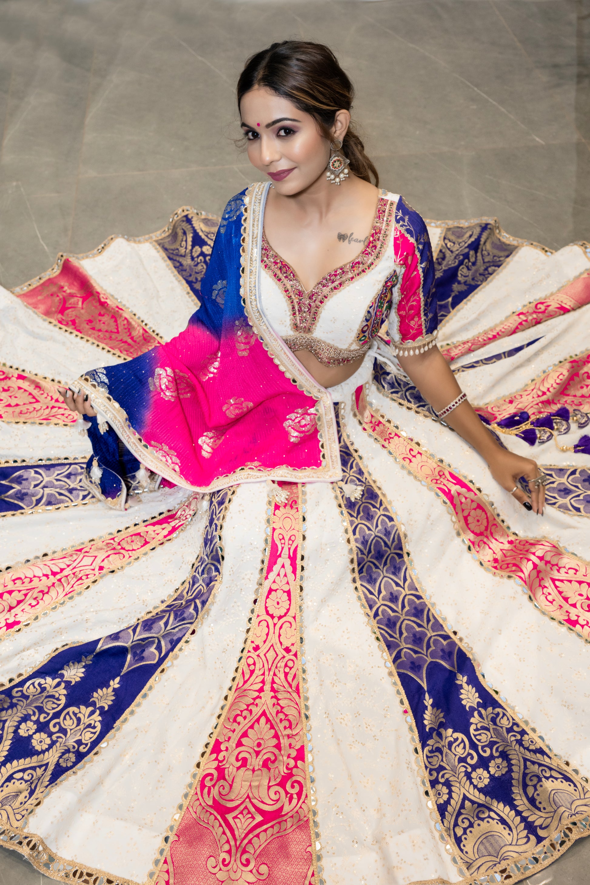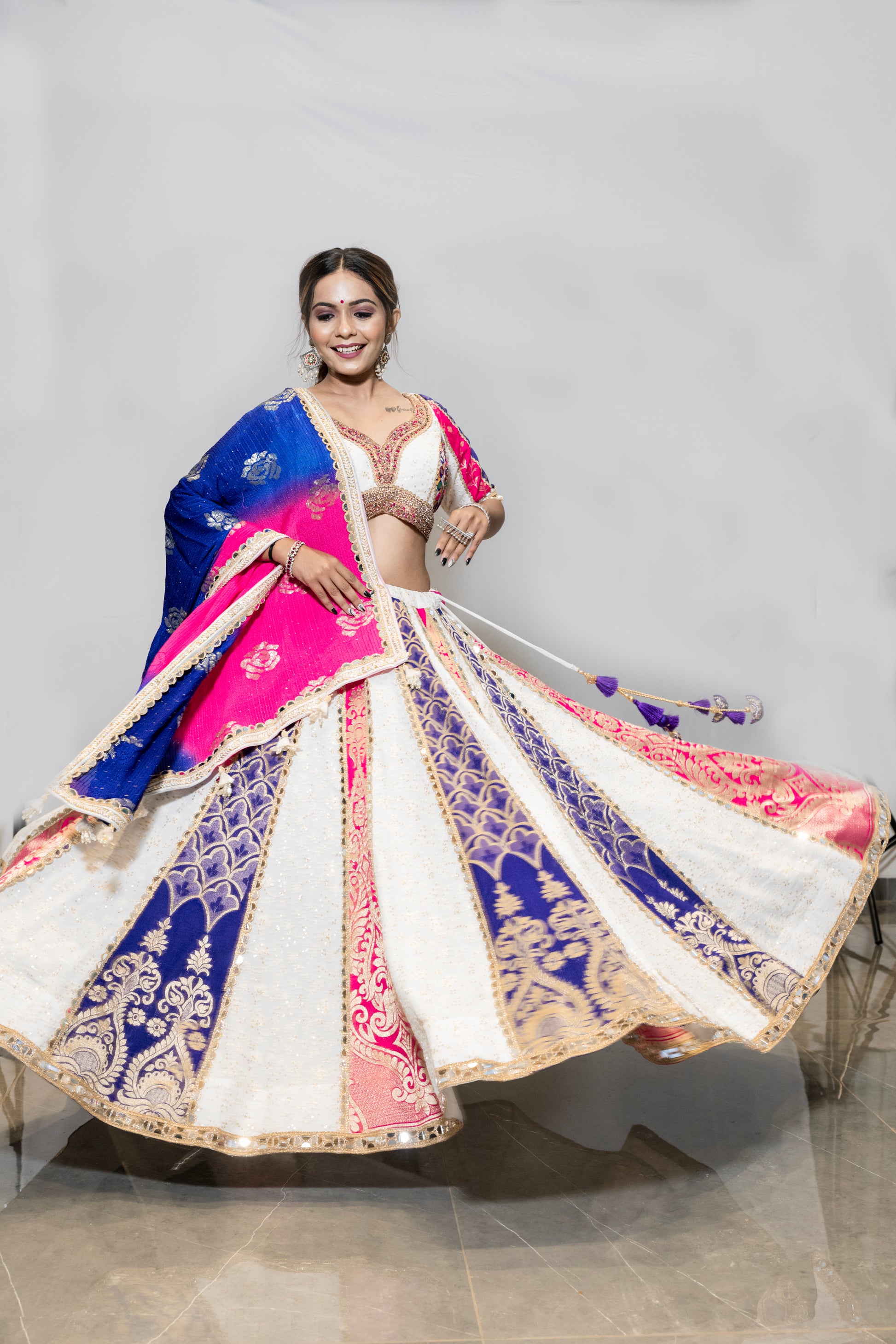 Beautiful White base chaniya with different Layers of Pink and Blue broad art work on Exact distance.